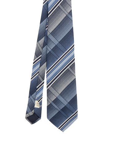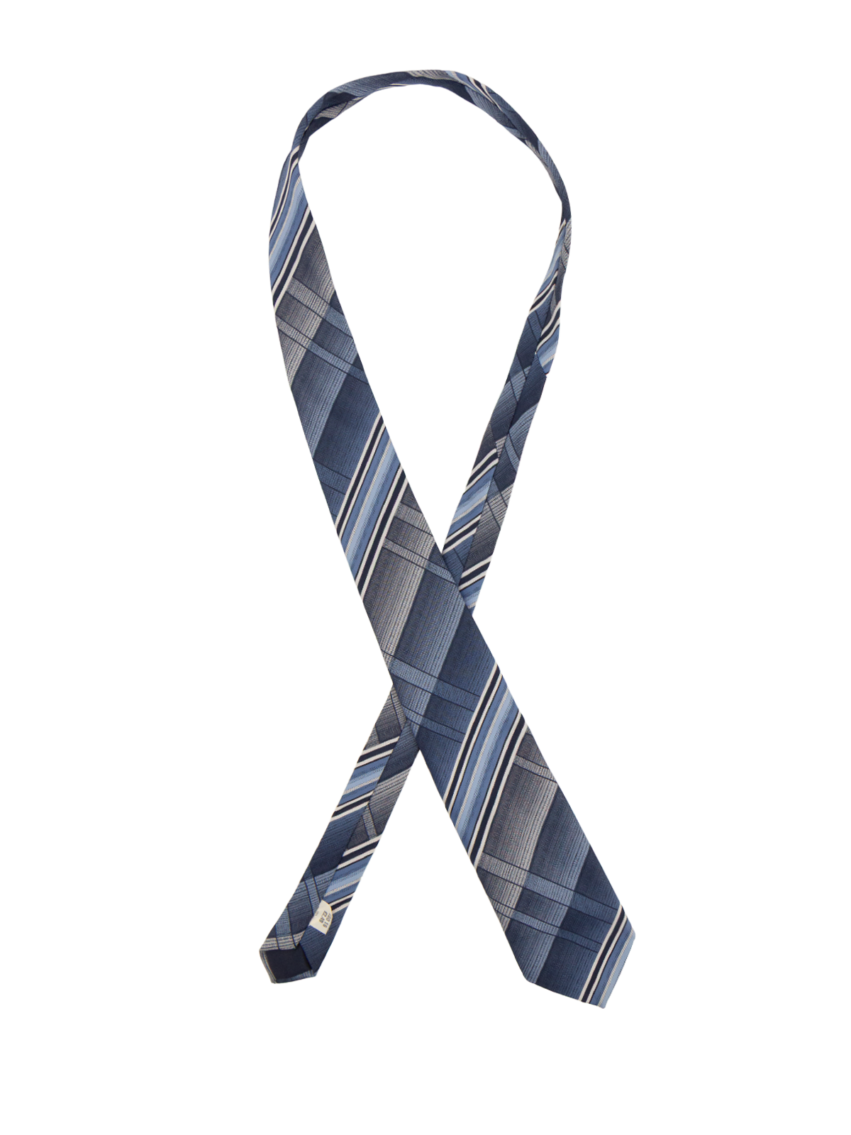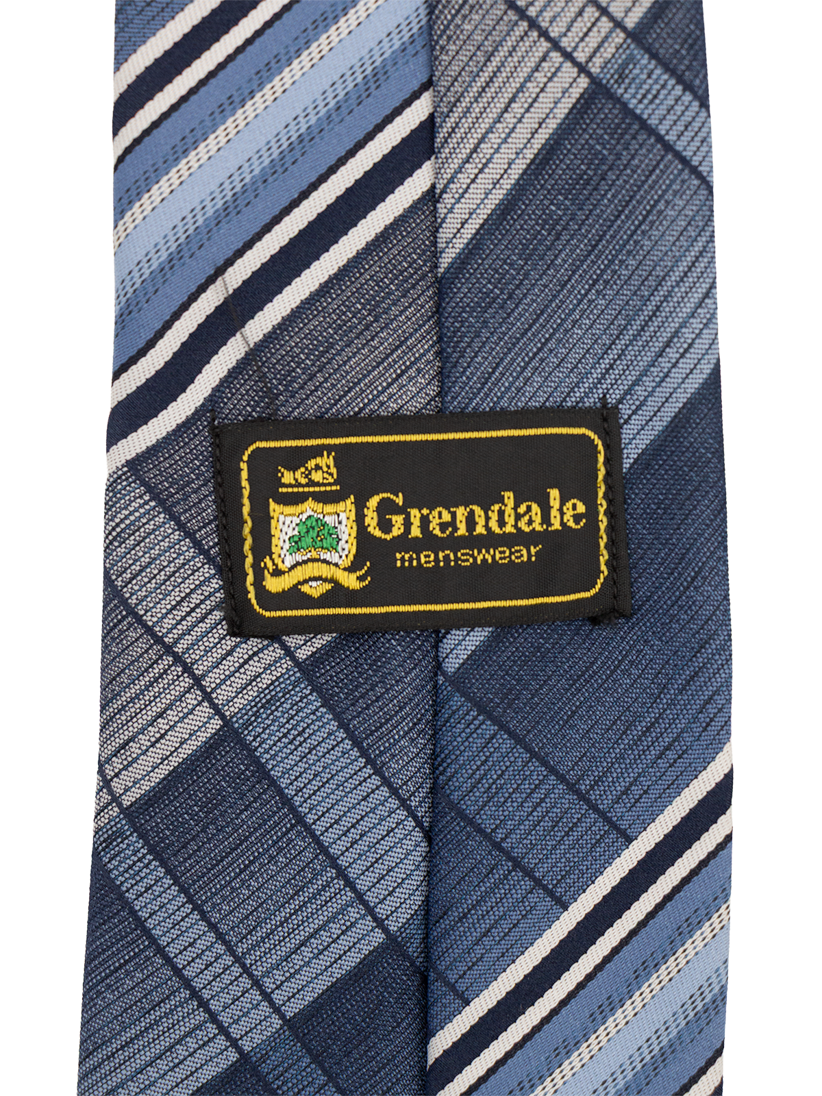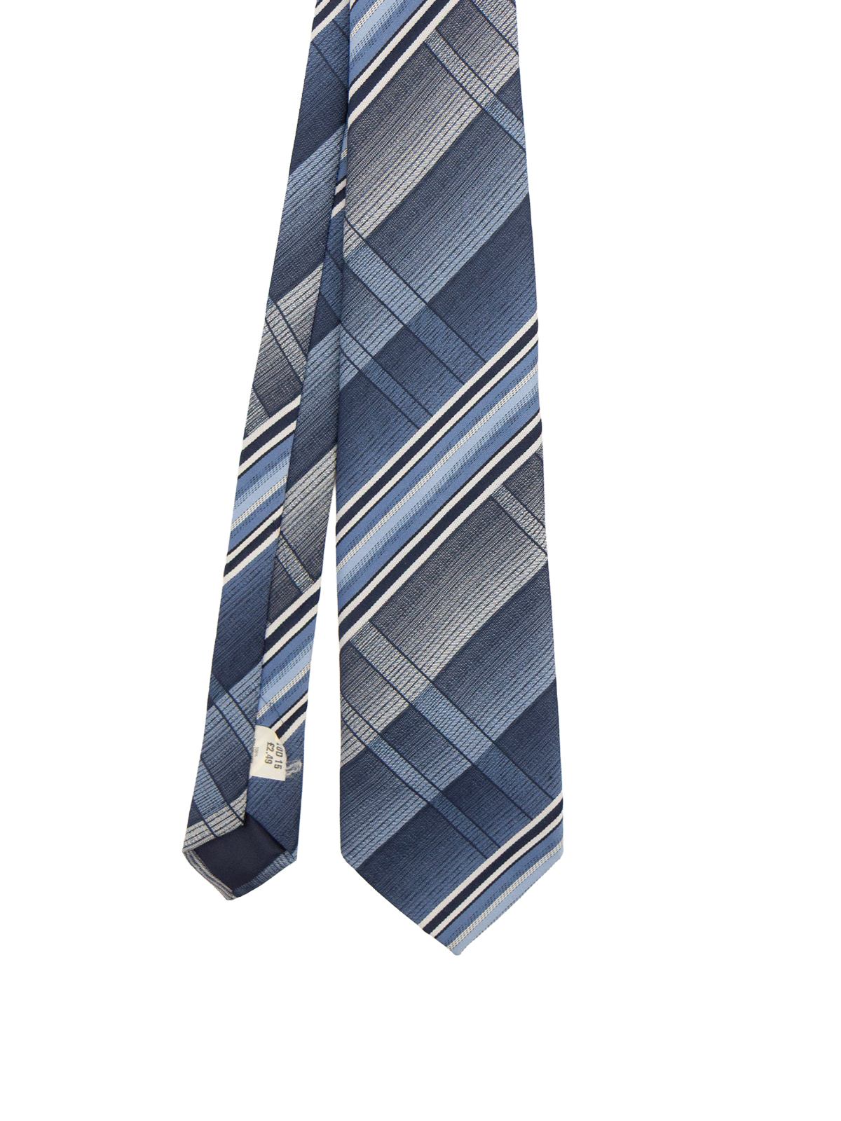 A refined true vintage tie featuring diagonal stripes in a stylistic check pattern, in tonal blues and white. Clean and balanced, the muted palette keeps it versatile. An easy, timeless piece for both classic and contemporary tailoring.