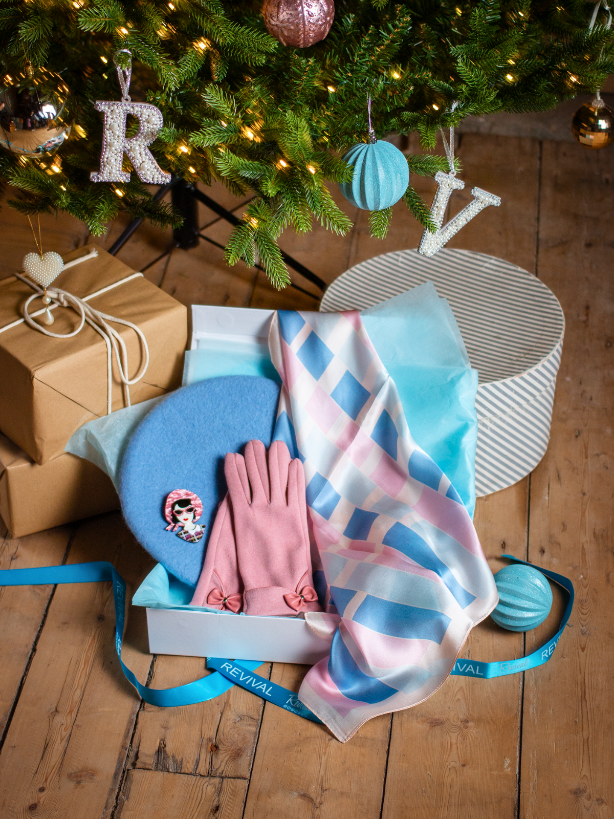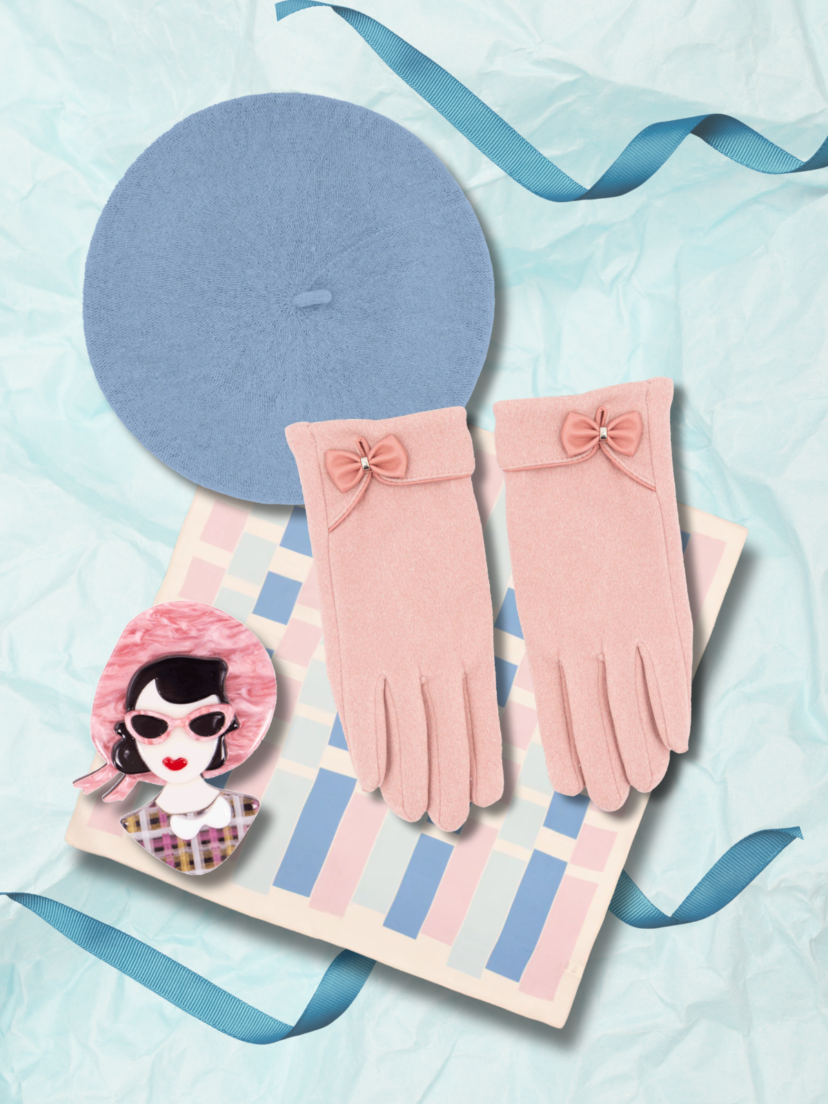 Thoughtfully selected for charm, quality, and style, this set includes a pure wool beret in sky blue, bow detail gloves in pink, a vintage style silk scarf in tonal pinks and blues and a retro acrylic brooch.