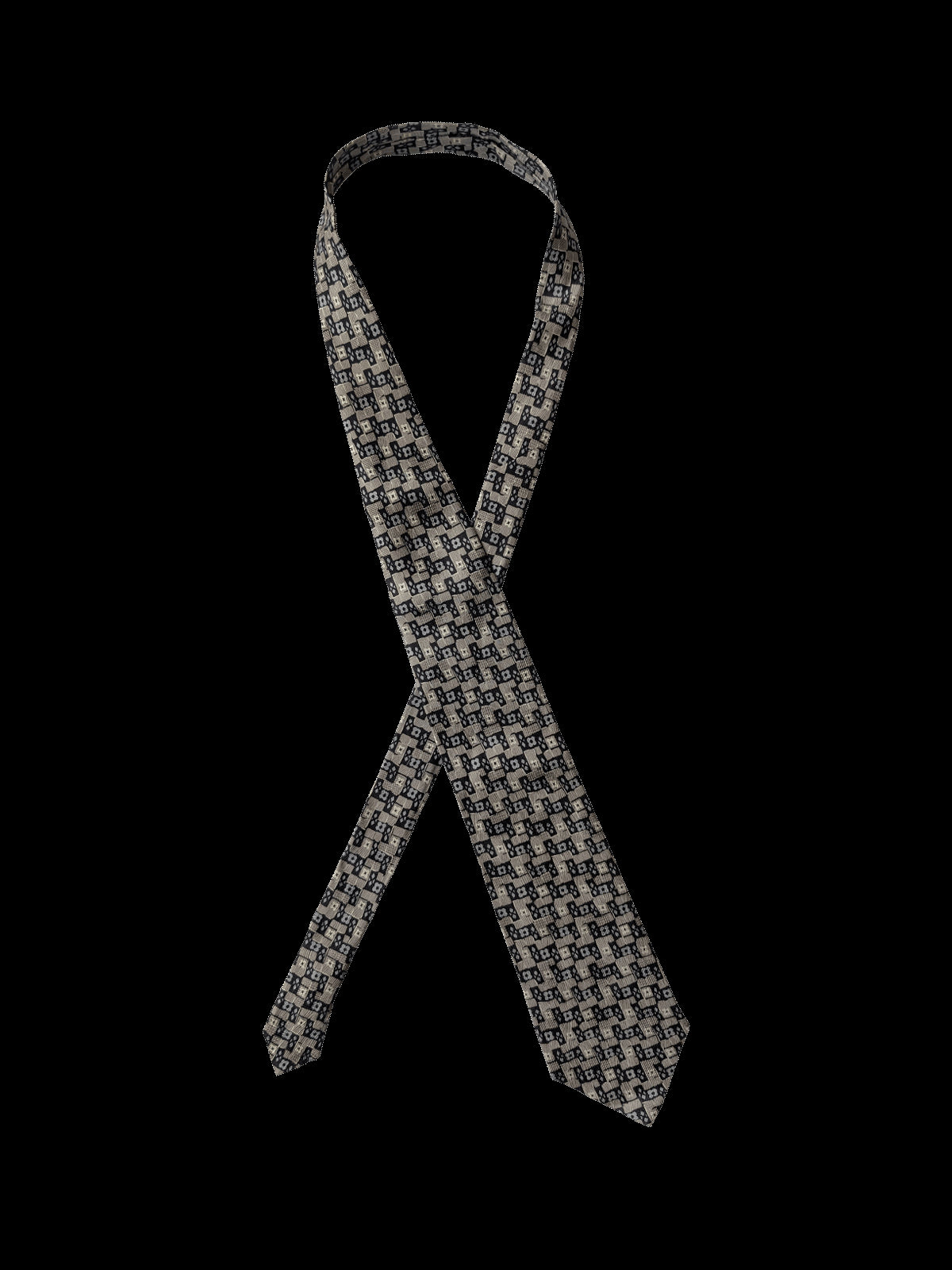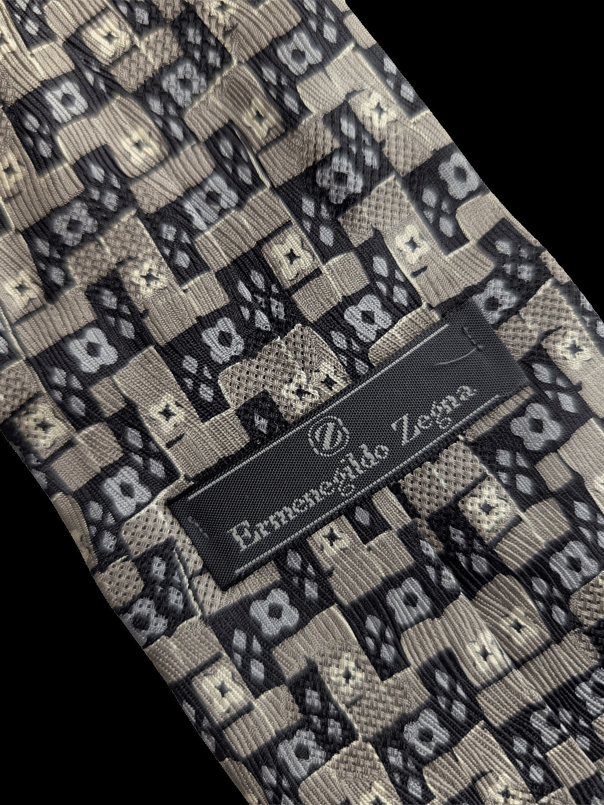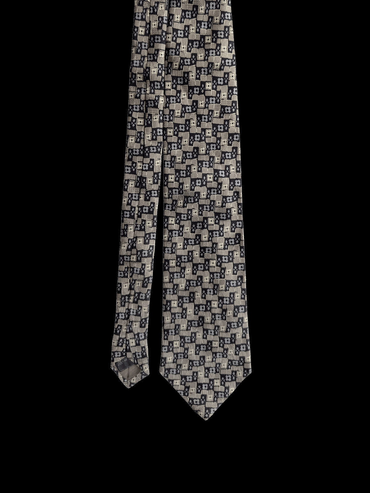 A designer tie with the quality you would expect from Ermenegildo Zegna label. Featuring an eye catching geometric repeat pattern of alternating small squares and stylised floral motifs in tonal grey, black, and white accents. A stylish way to add a dapper touch to your vintage style shirts.