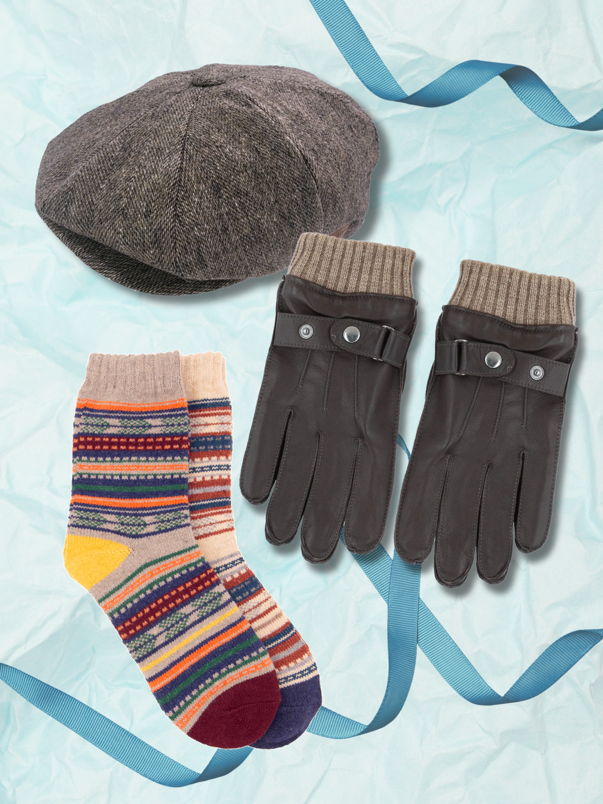 Thoughtfully selected for quality, character, and classic appeal, this set includes brown leather gloves, two pairs of socks and a wool herringbone newsboy cap in brown.