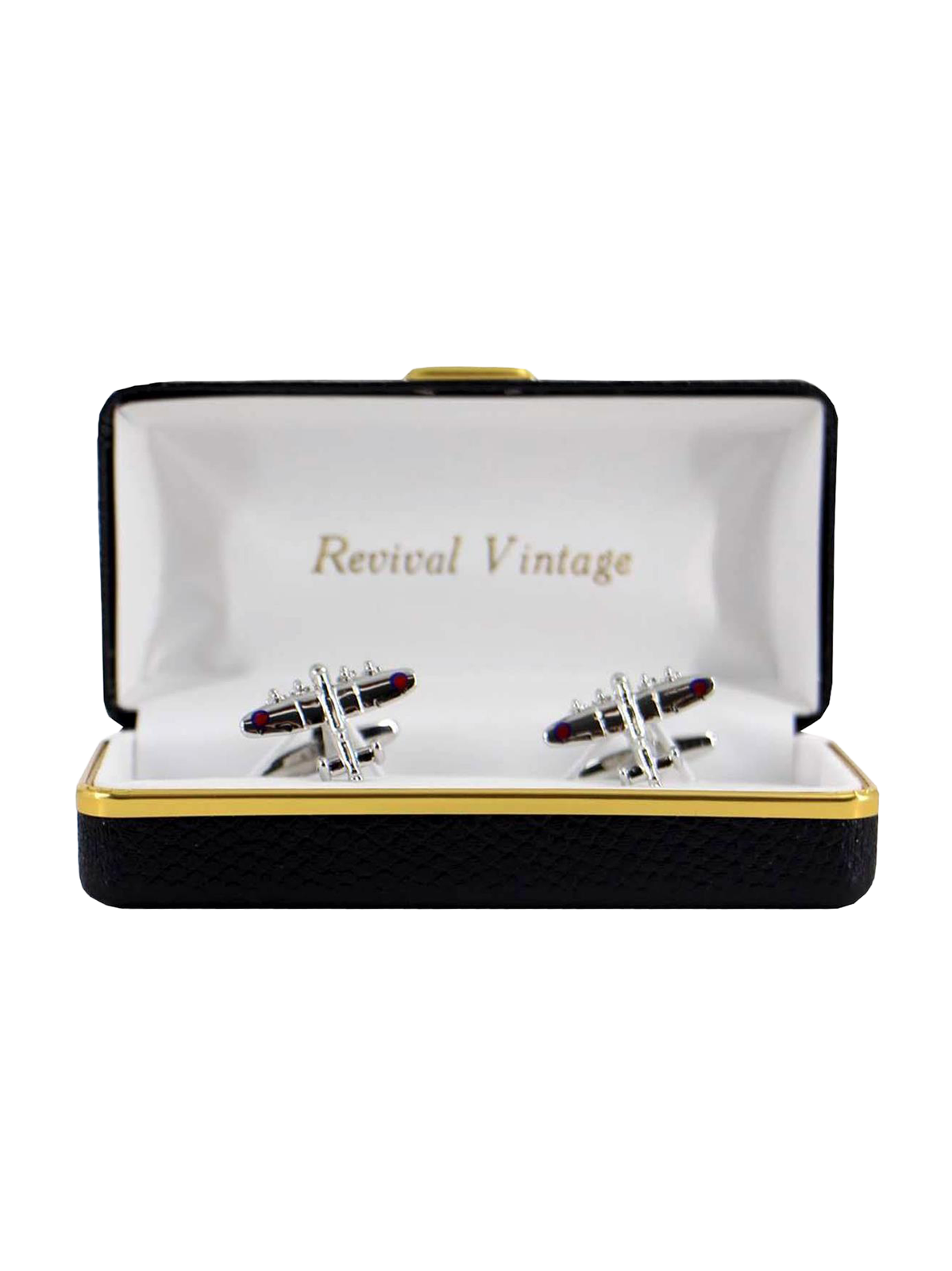 Highly polished silver tone cufflinks in the shape of the iconic RAF Lancaster Bomber aeroplane, finished with a hinged stopper. A refined finishing touch to a 1940s demob suit or similar vintage inspired outfit. Presented in a smart Revival gift box with gold detailing.
