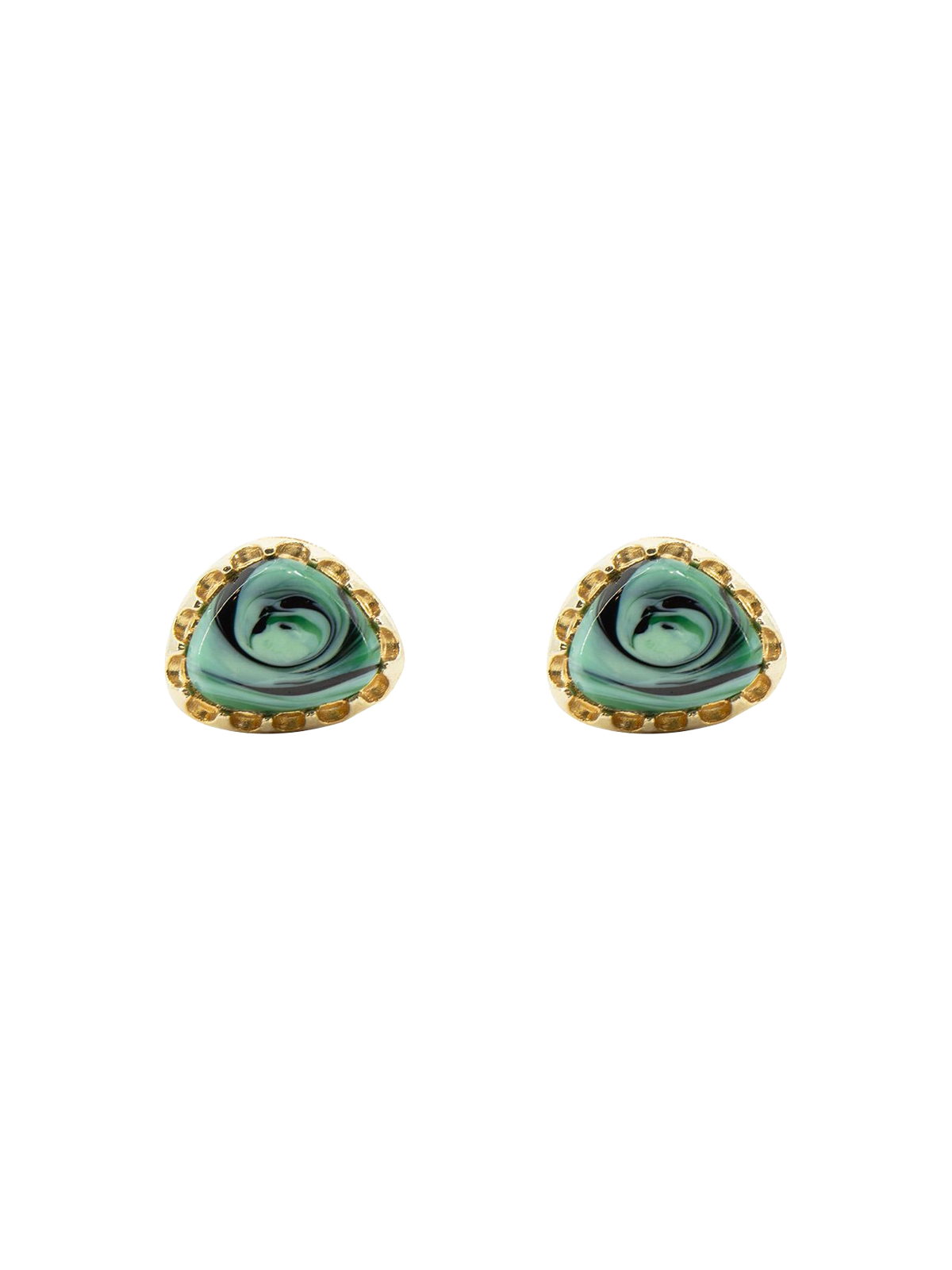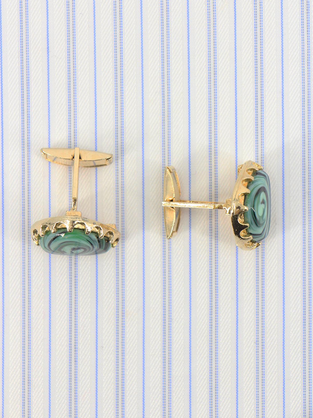 Authentic 1950s deadstock cufflinks in gold plate, set with marbled green glass cabochons in a soft triangular mount with curved edges. The glass ranges in shade from mint green to dark moss, creating a striking effect against the unusual setting. Complete with a suedette gift pouch.