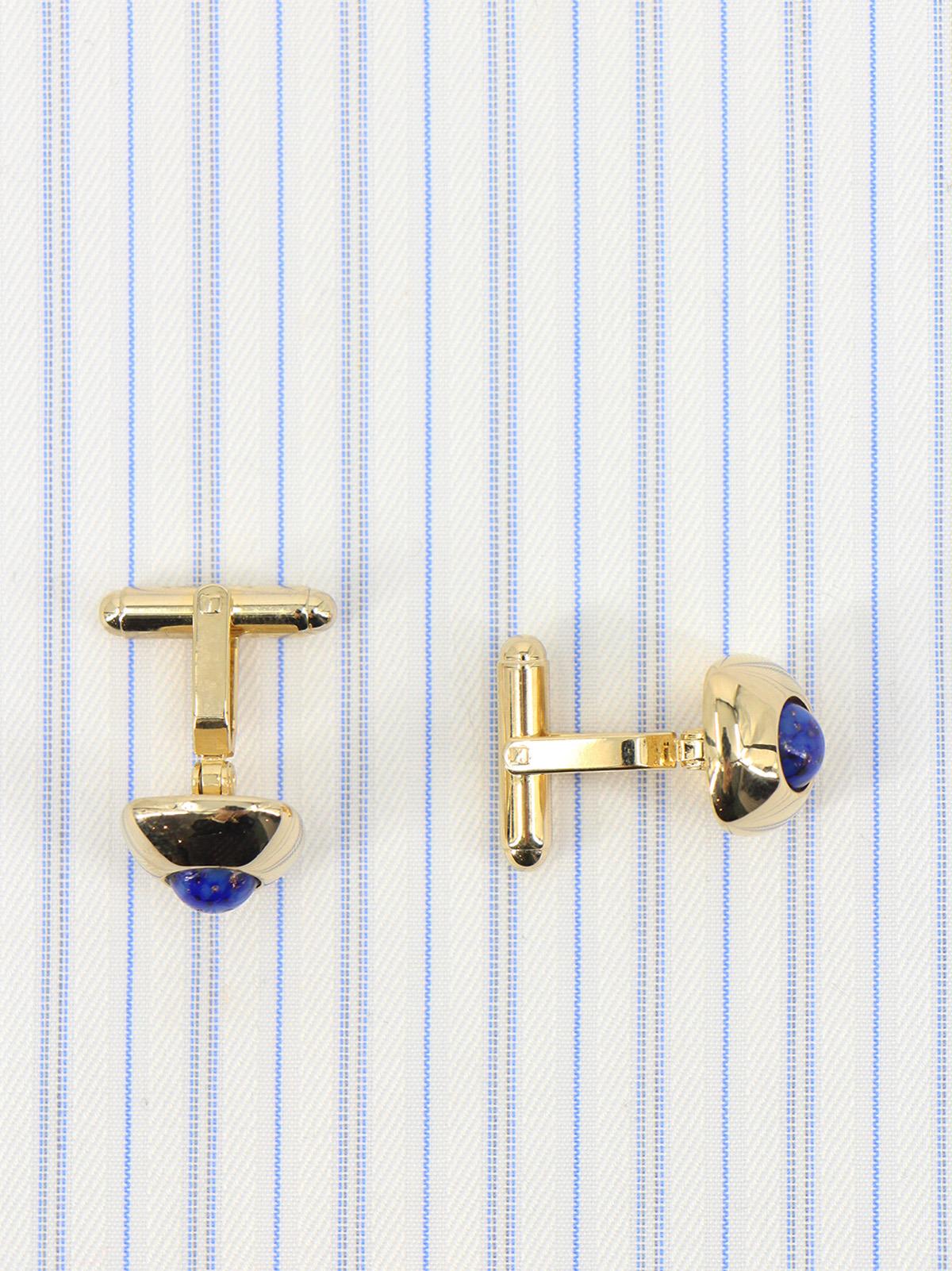 Authentic 1960s deadstock cufflinks in gold plate, set with blue glass cabochons designed in the style of lapis lazuli. The cabochons beautifully imitate the gemstone with deep, varied blues and subtle gold flecks, all within a rounded cuboid closed setting. Complete with a suedette gift pouch.