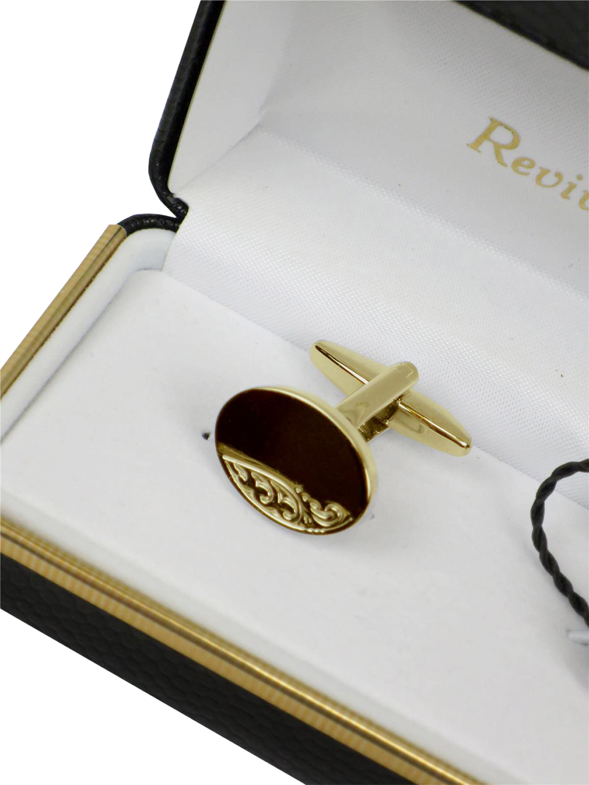 Gold plated oval cufflinks with a refined engraved pattern along the lower edge. A timeless vintage inspired design with swivel catches for secure fastening. Presented in a Revival black presentation box.