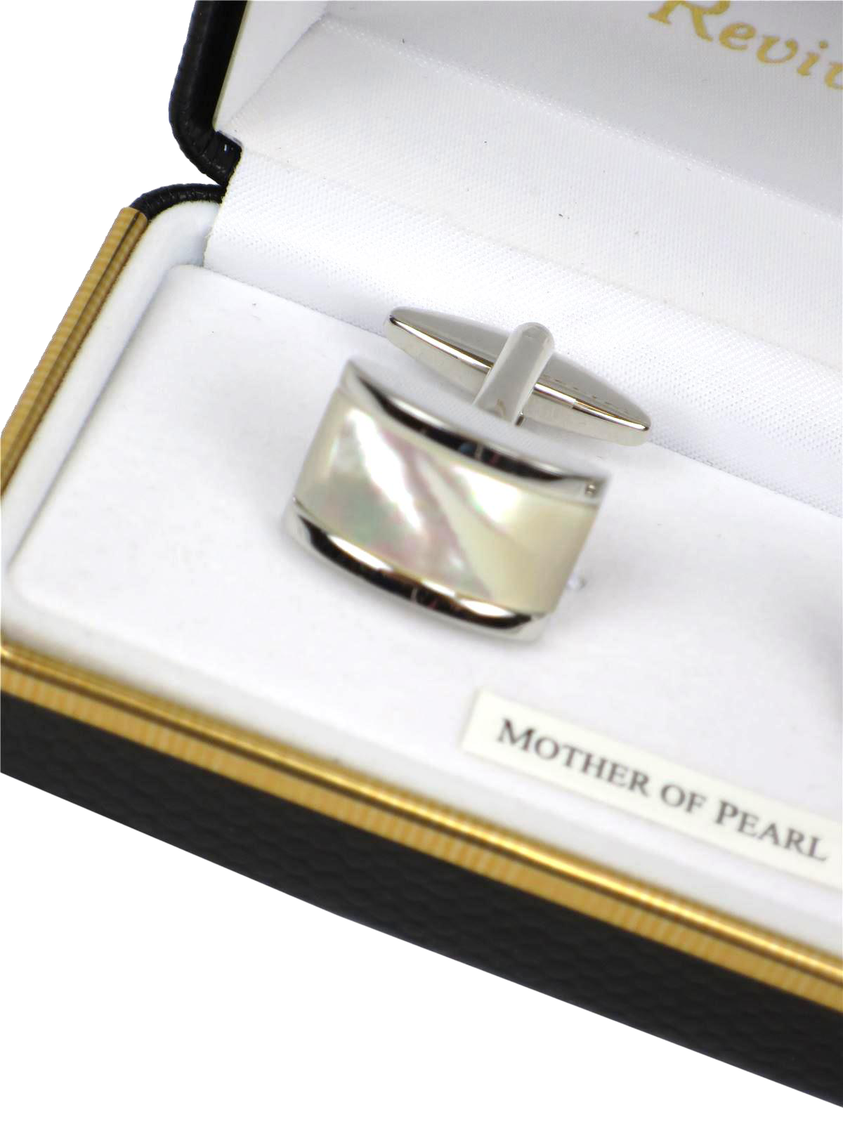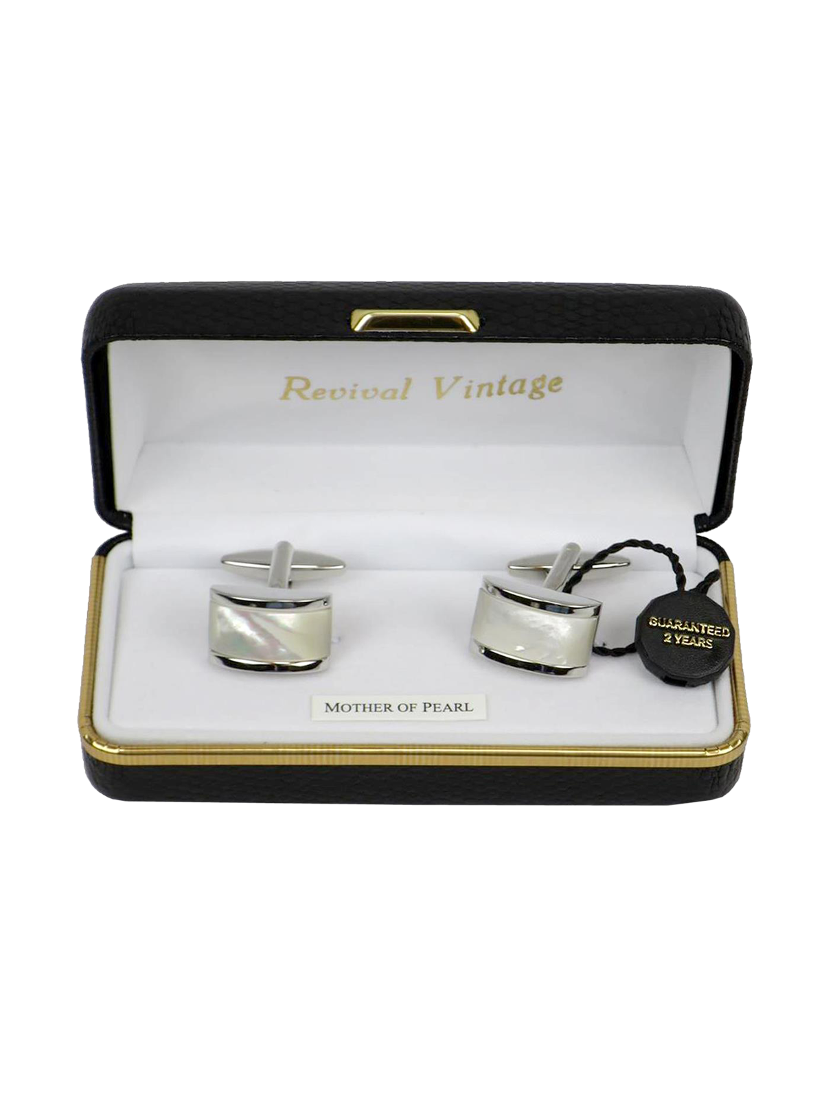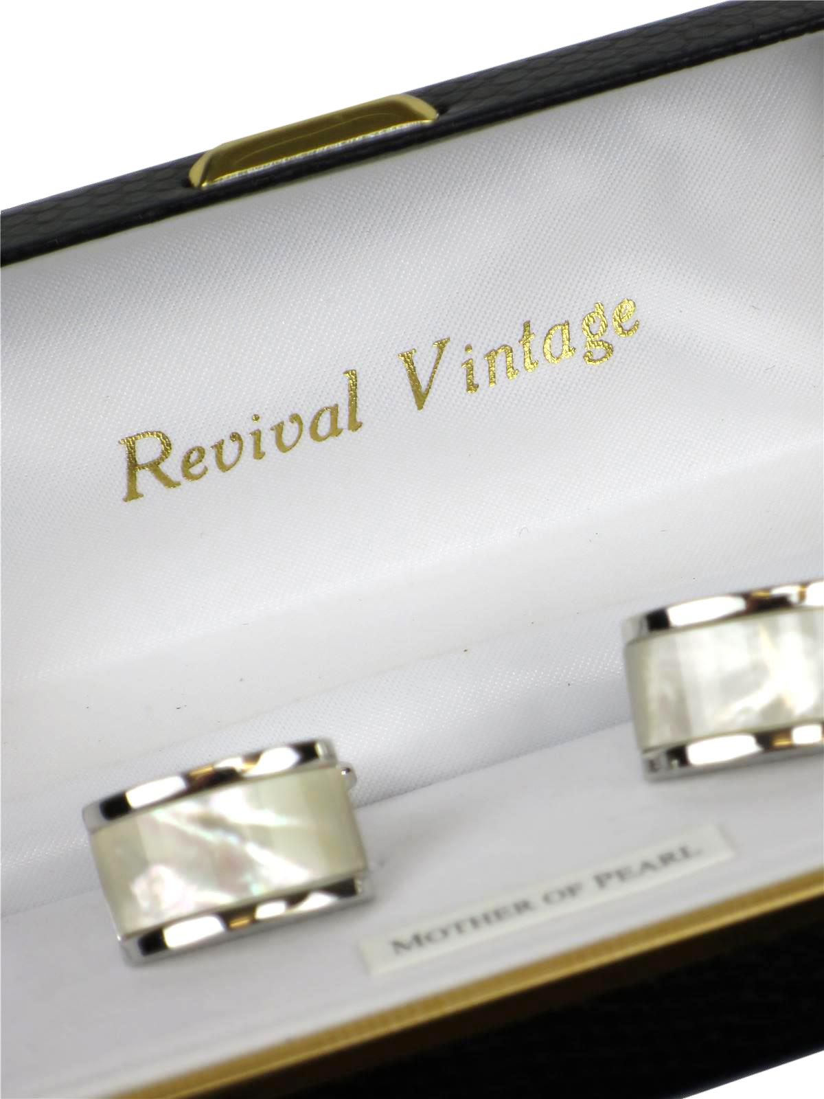 Rectangular cufflinks with domed mother of pearl fronts, set in a polished frame. A smart vintage inspired design with swivel catches for secure fastening. Presented in a Revival black presentation box.