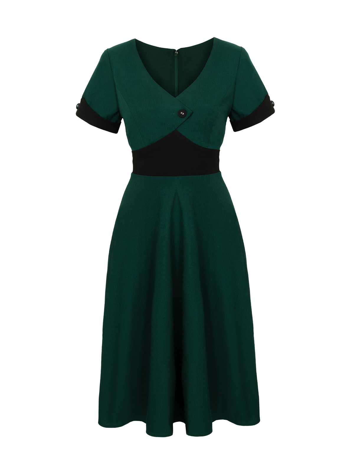 This dress brings vintage glamour in emerald green with chic black accents. Featuring a V-neckline with buttoned wrap detail, fitted bodice, and flared skirt with side pockets, this 1950’s inspired midi flatters every curve.