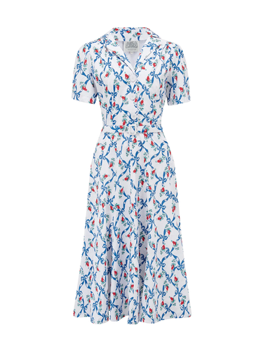 The print features intertwining blue bows and delicate pink rosebuds for a truly feminine touch. Authentic details such as Bakelite style buttons and practical side seam pockets complete the vintage look.