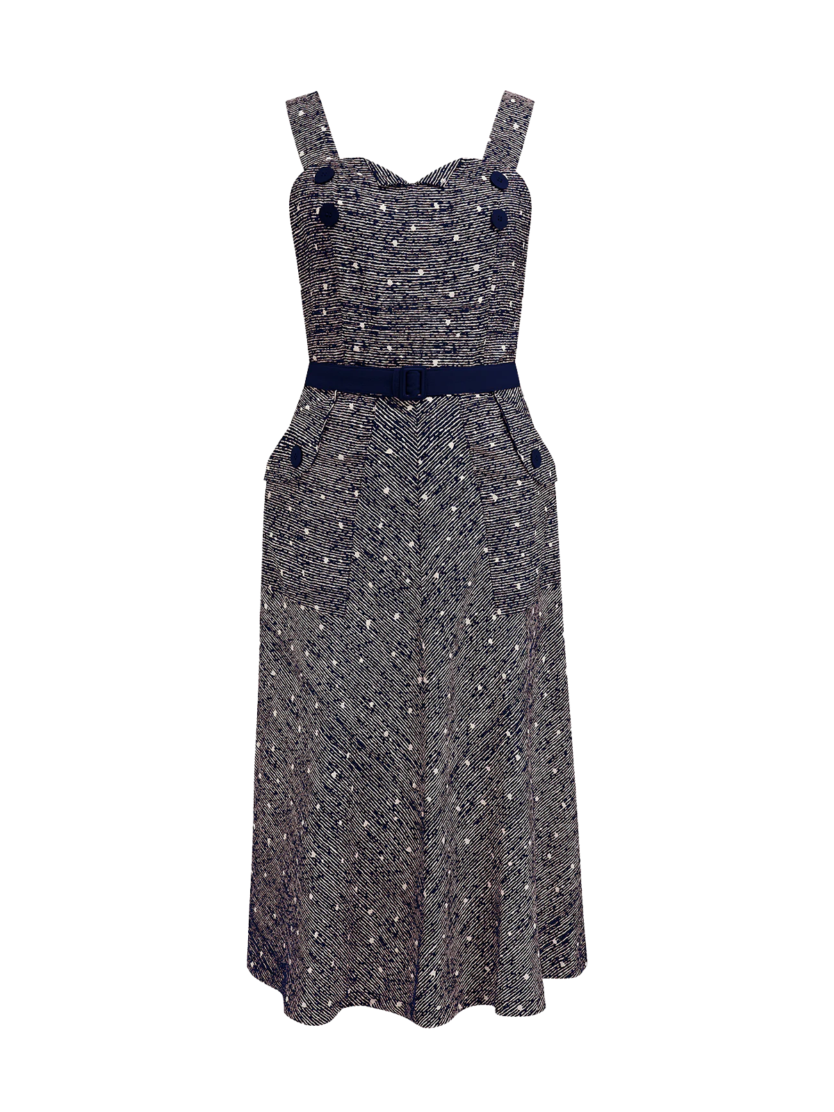 This two-piece set is a brilliant vintage staple, comprising of both a navy blue dress, in a ditsy polka dot print, and a navy shrug-style bolero that can be worn together or separately. This wonderful, easy to wear dress radiates authentic late 1940s to early 1950s.