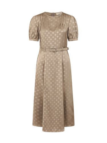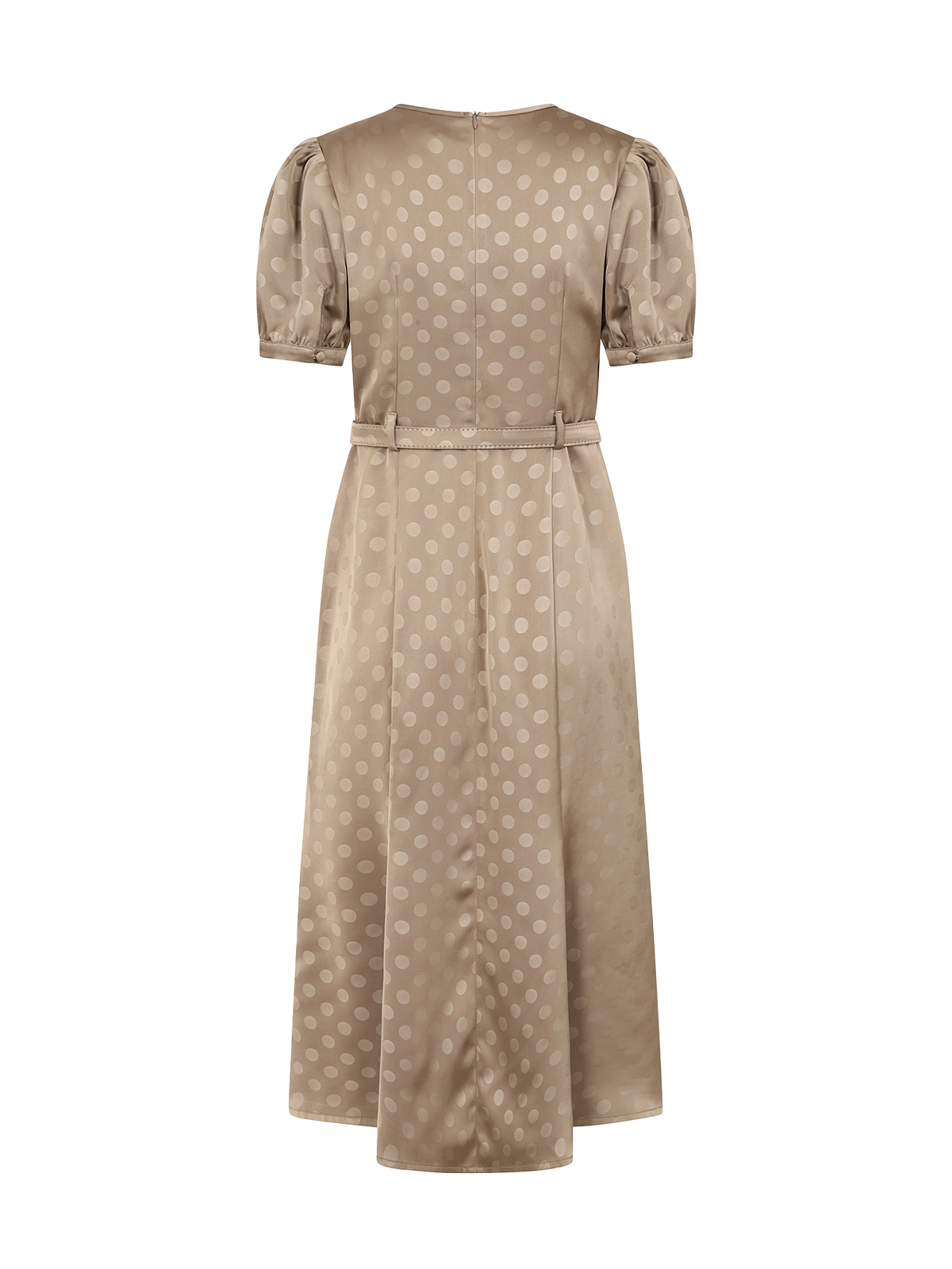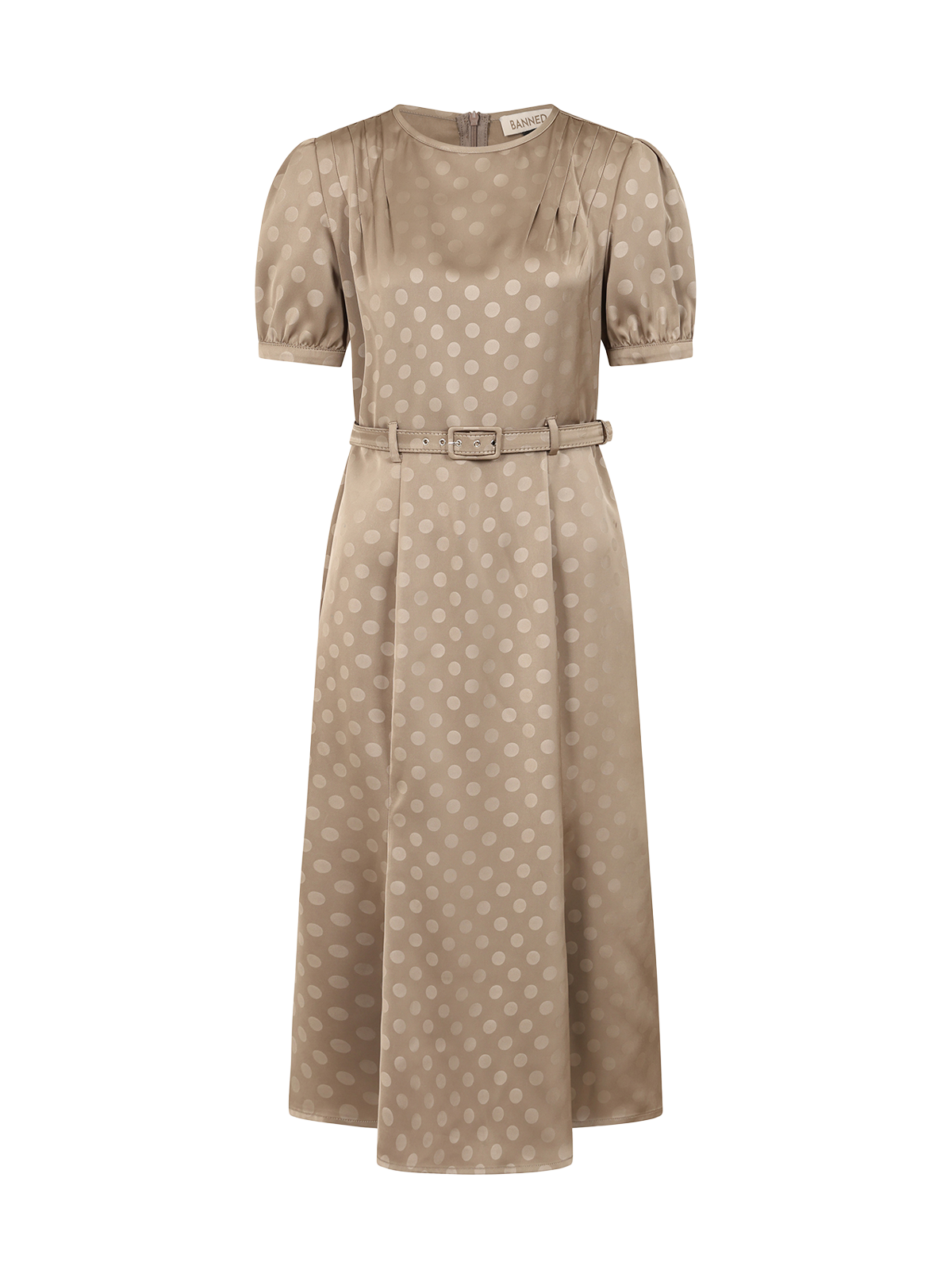 This elegant taupe midi dress in silky satin with tonal polka dots is a timeless piece, perfect for vintage-inspired occasion wear. Designed with pleated shoulders and short puff sleeves, it captures the charm of classic mid-century style. A matching fabric belt cinches the waist for a beautifully feminine silhouette. Ideal for both daytime and evening events, this dress is a graceful wardrobe addition for any vintage enthusiast.