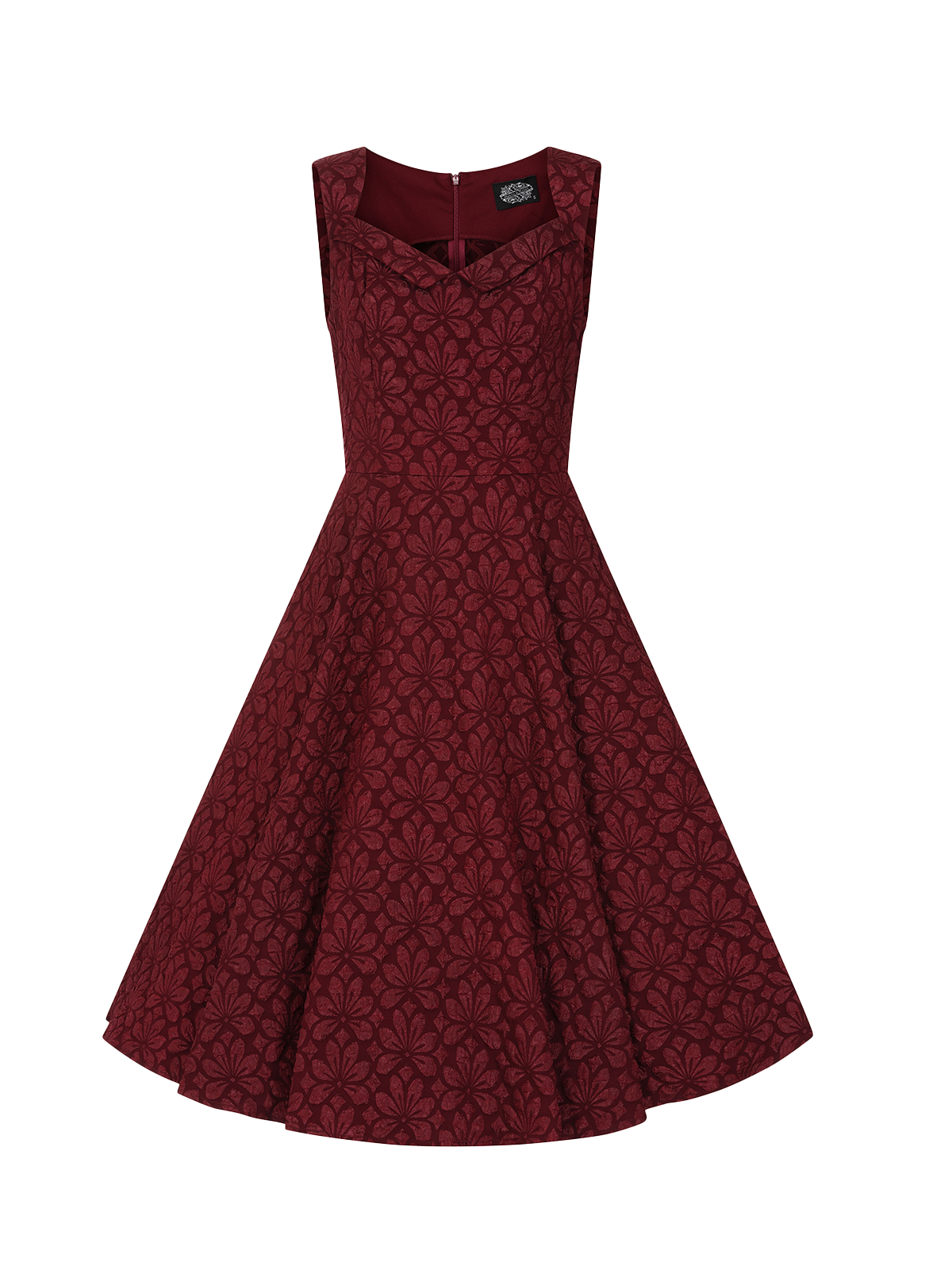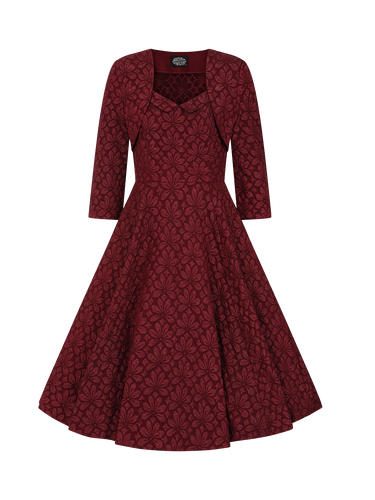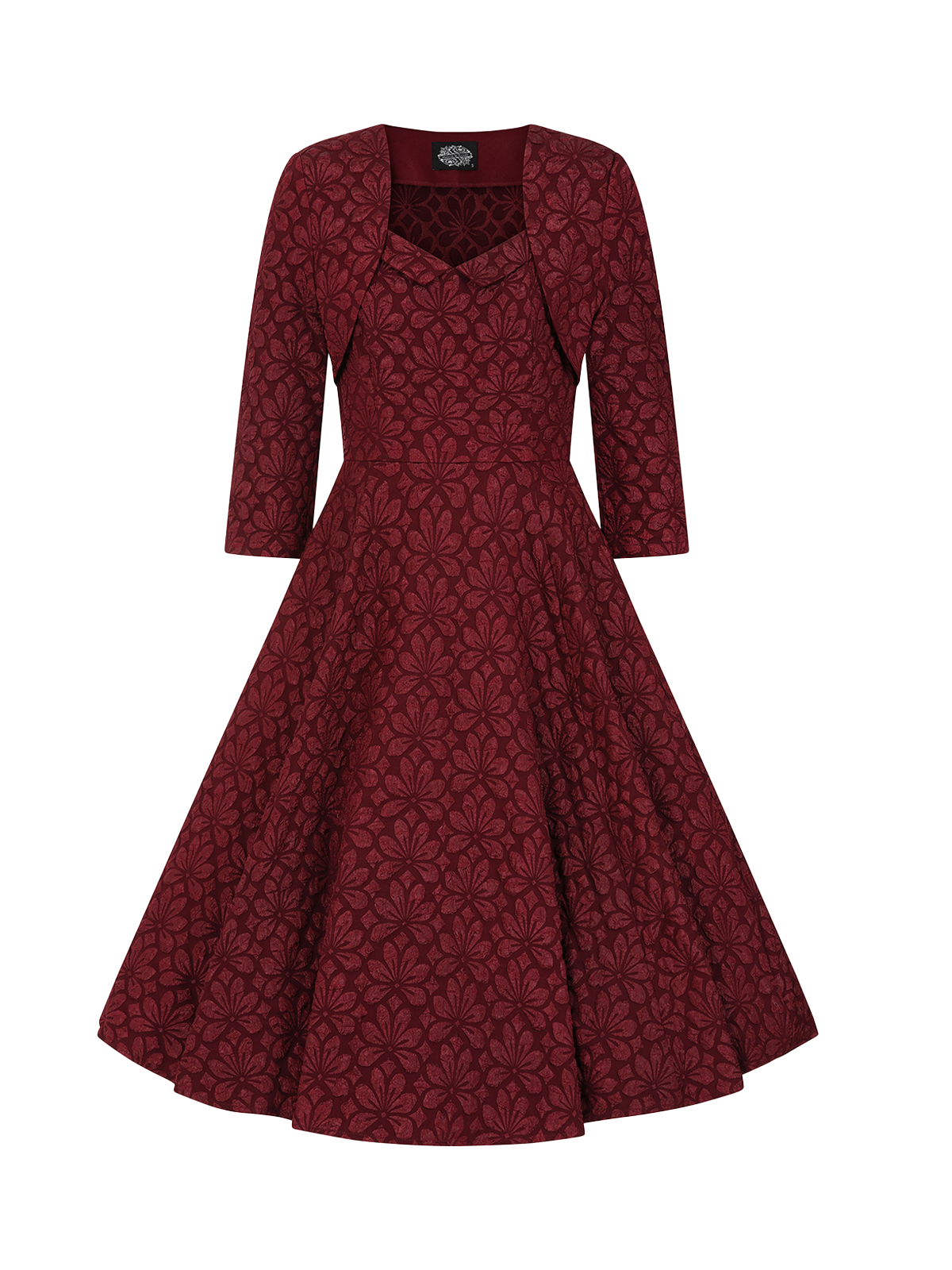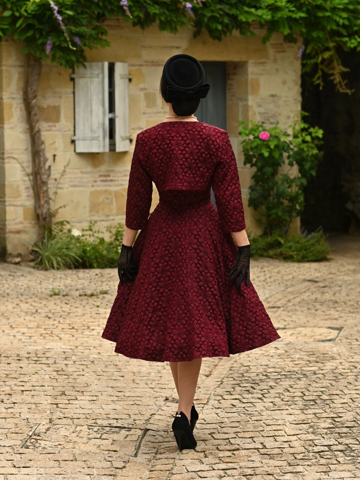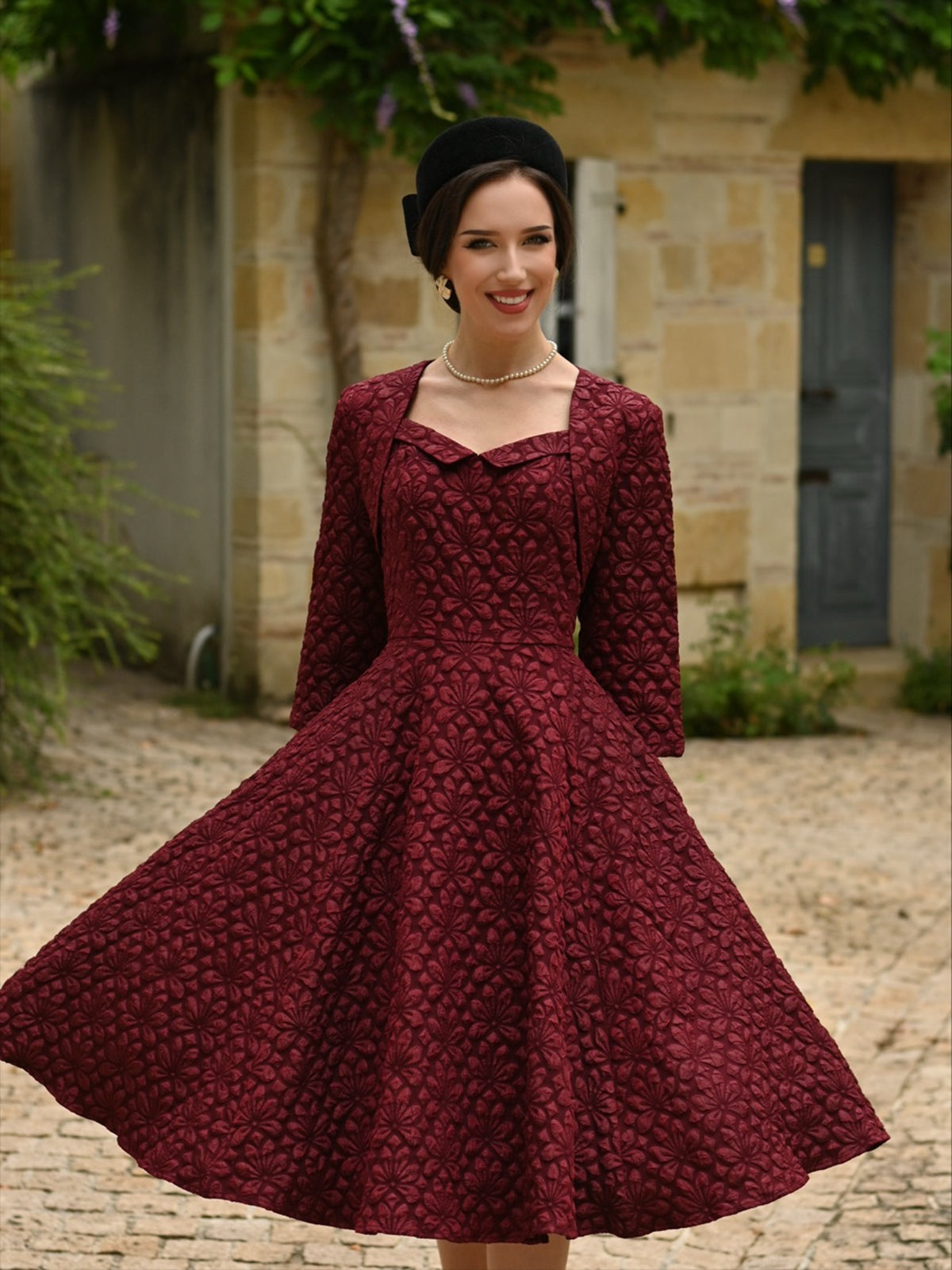 A vintage inspired swing dress in a deep wine shade with an embossed floral print. The fitted bodice shapes the waist, flowing into a full swing skirt for a classic 1950s look. A lapel neckline adds retro detail, and the matching bolero completes the outfit with elegance.