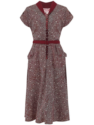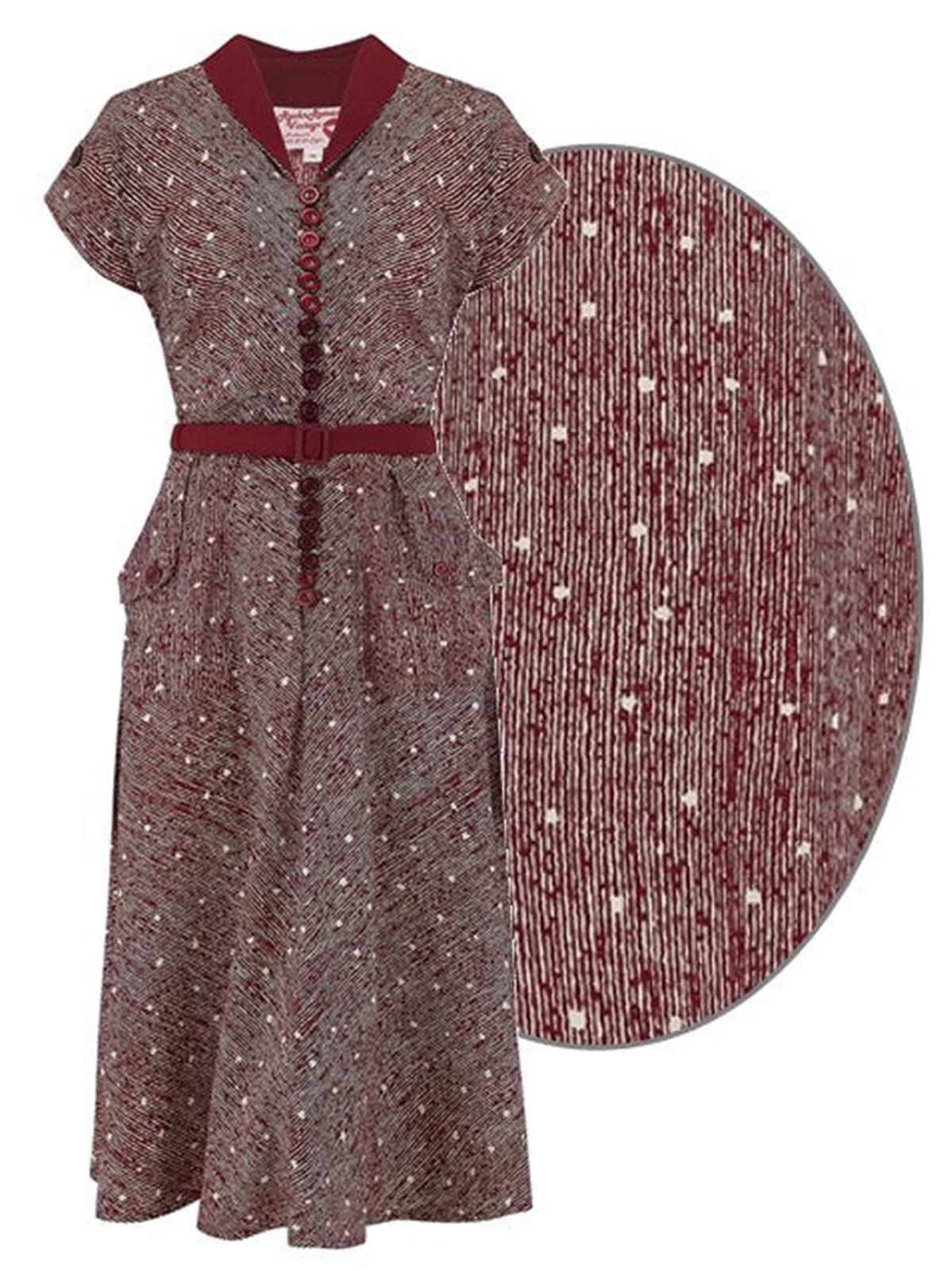 The iconic fifties print features white irregular stripes and polka dots on a wine-red background. It is a direct copy of a true vintage fabric, realised in authentic poly crepe fabric which hangs beautifully and is soft to the touch.