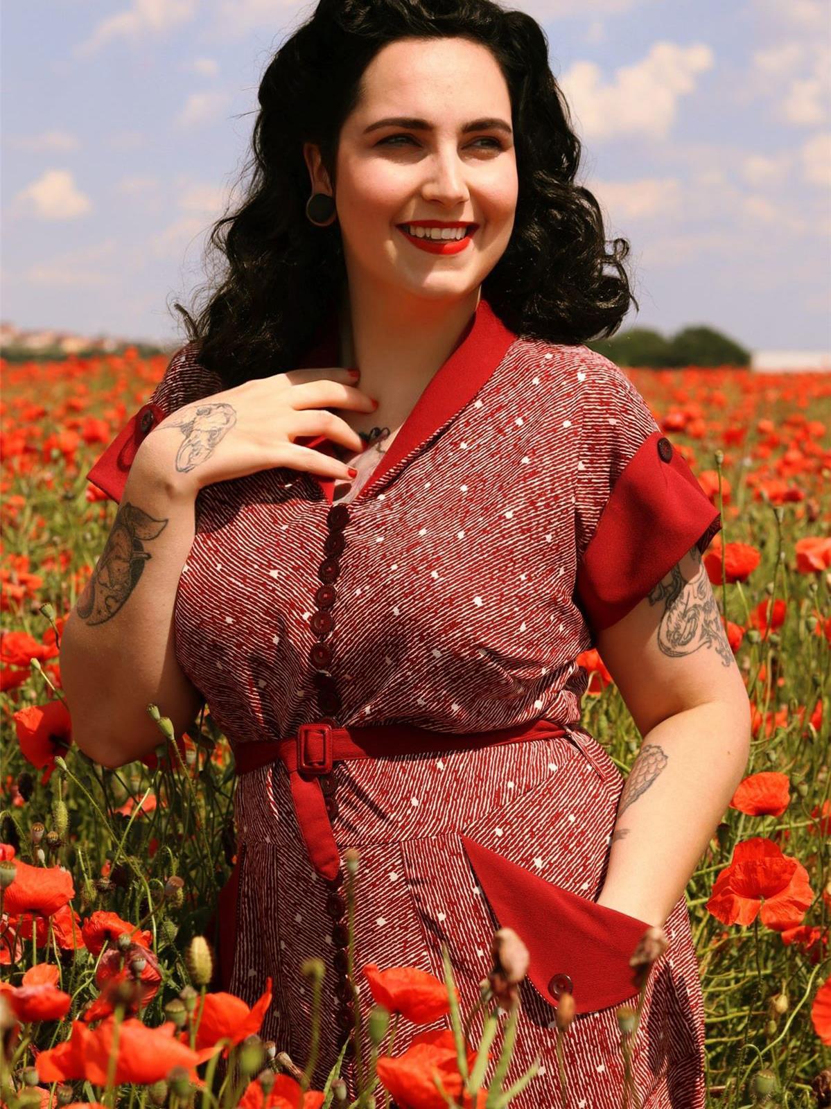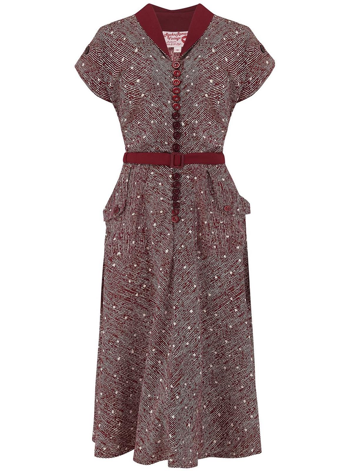 An exact copy of an original 1950s day dress, with superb retro details like the contrast collar, oversized patch pockets and row of front buttons.