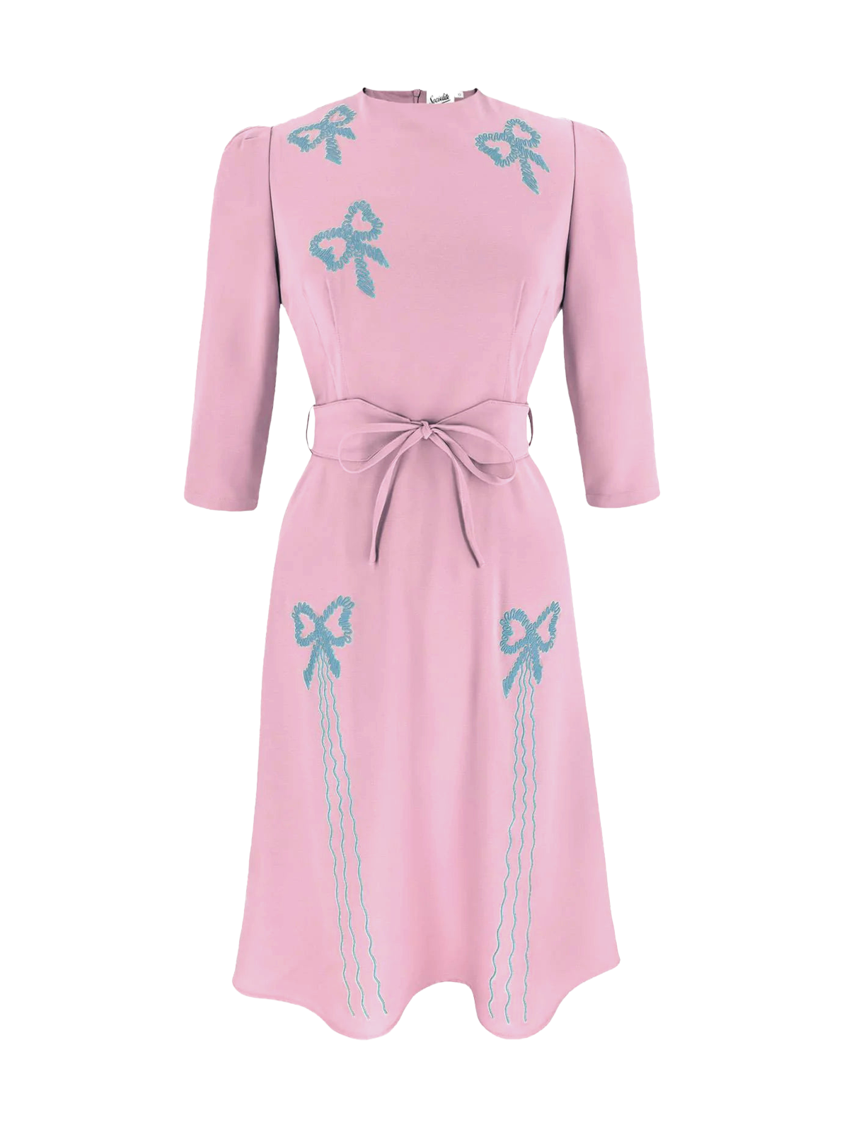 Our 1940s authentically replicated dress, the Beau Belle, is a feminine fitted style in a baby pink shade with wonderful feature blue bow motif embroidery. It has been thoughtfully realised in a heavier-weight fabric and is fully lined for the colder weather. Perfect for brunch with the ladies or a day trip adventure.