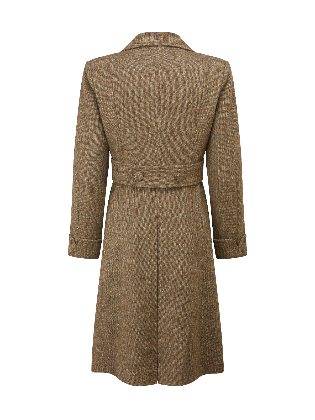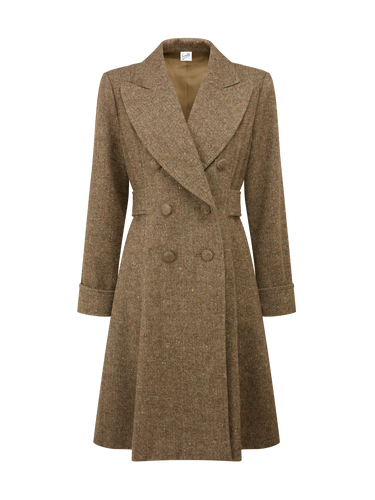 A double-breasted swing coat with a classic silhouette to create a graceful, flowing shape that falls just past the knee. The design includes a Martingale half belt, enhancing the tailored waistline while maintaining movement and comfort. Large notched lapels lend to a bold and timeless appearance, while the V-detail cuffs add subtle flair.