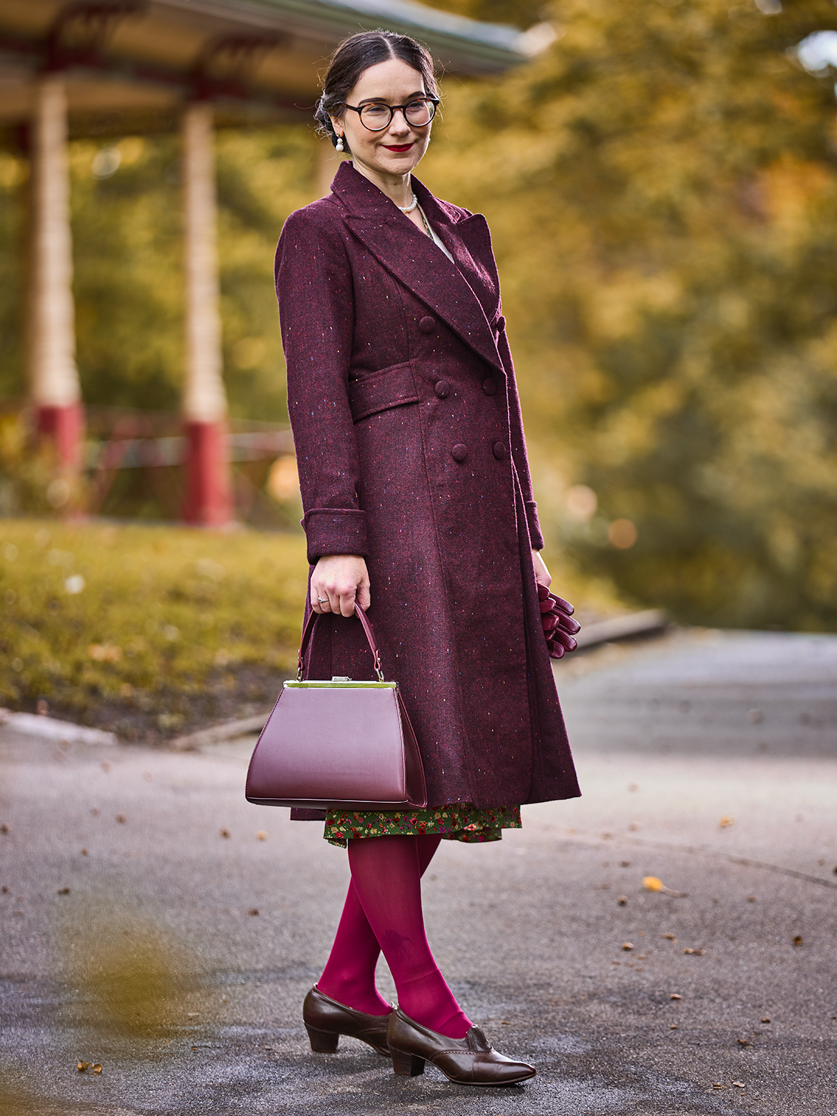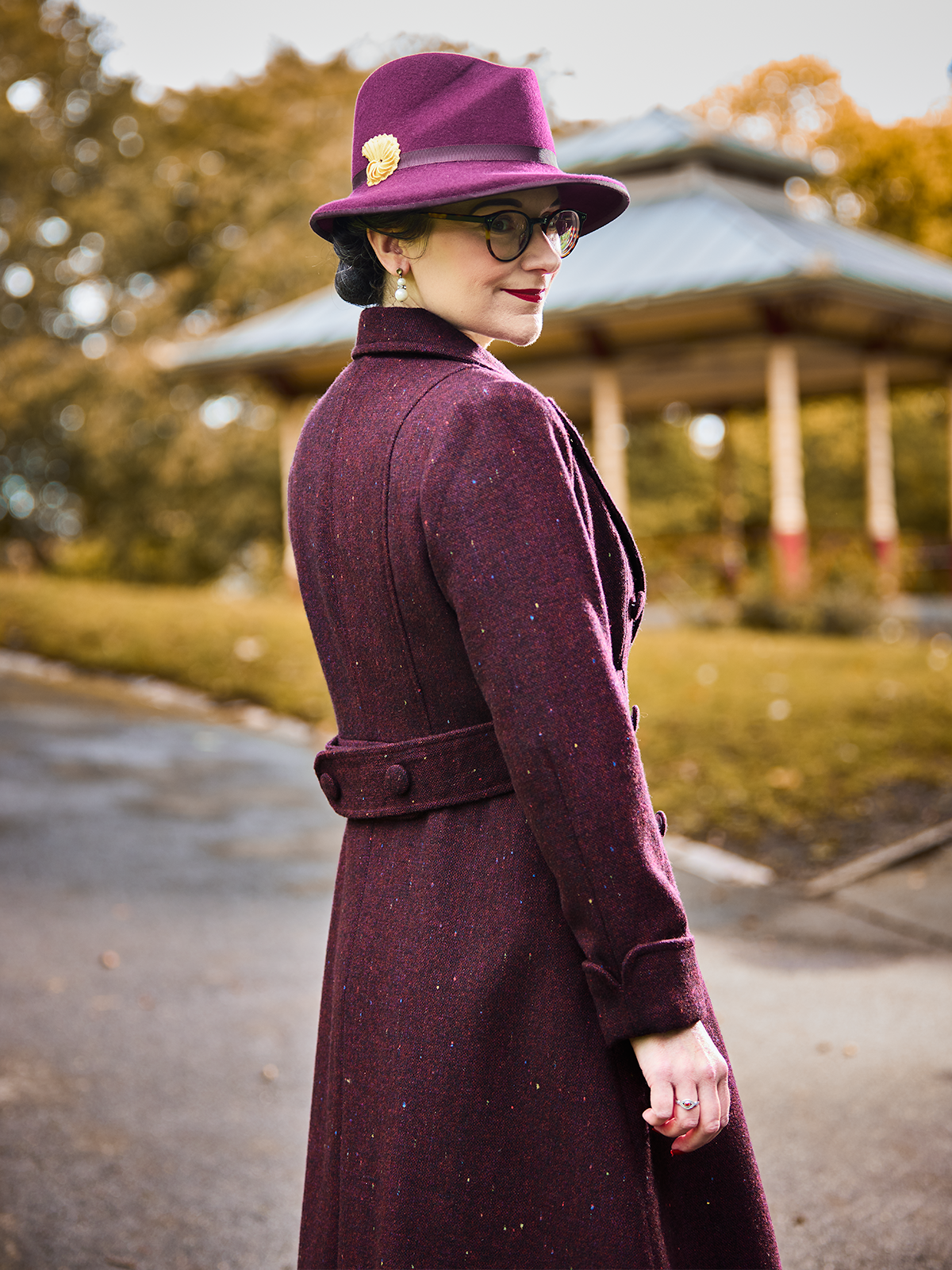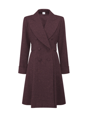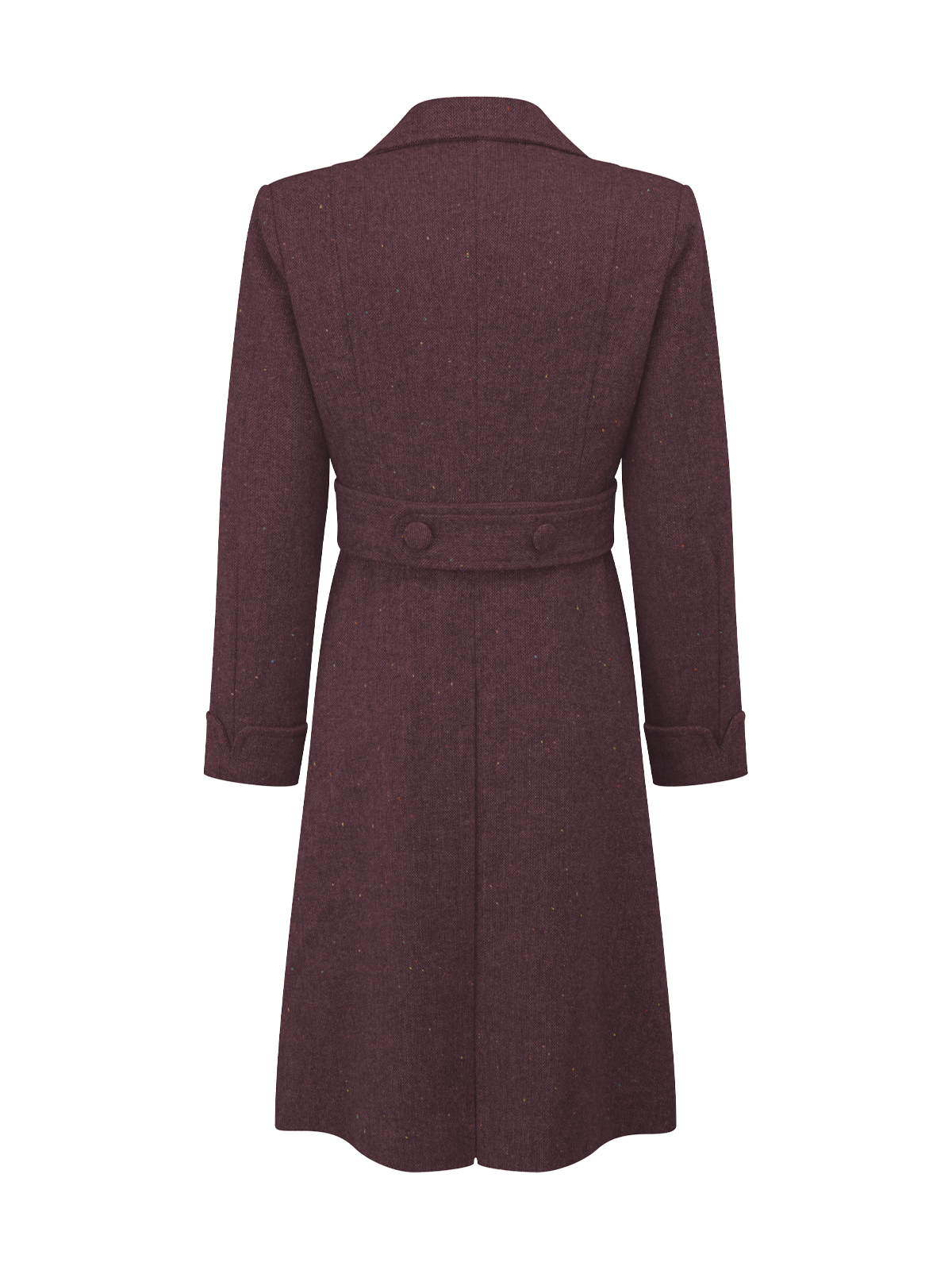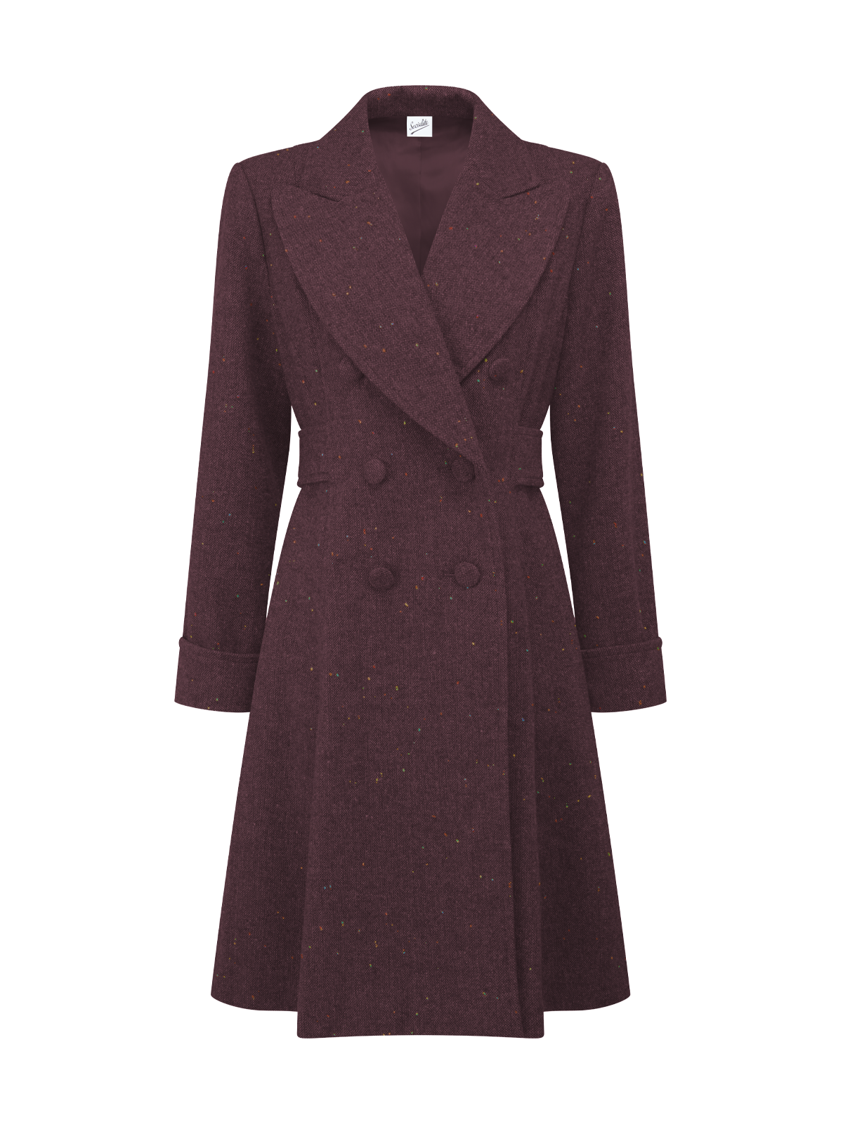 Crafted from a rich maroon fabric woven with a vibrant multicoloured fleck, the coat is both eye catching and sophisticated