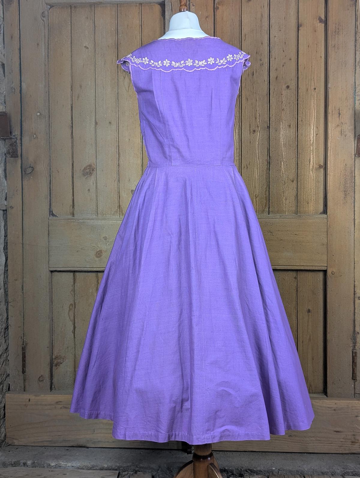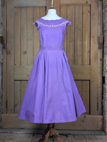 An original fifties dress with a pretty bardot style neckline highlighted with contrast white embroidery.