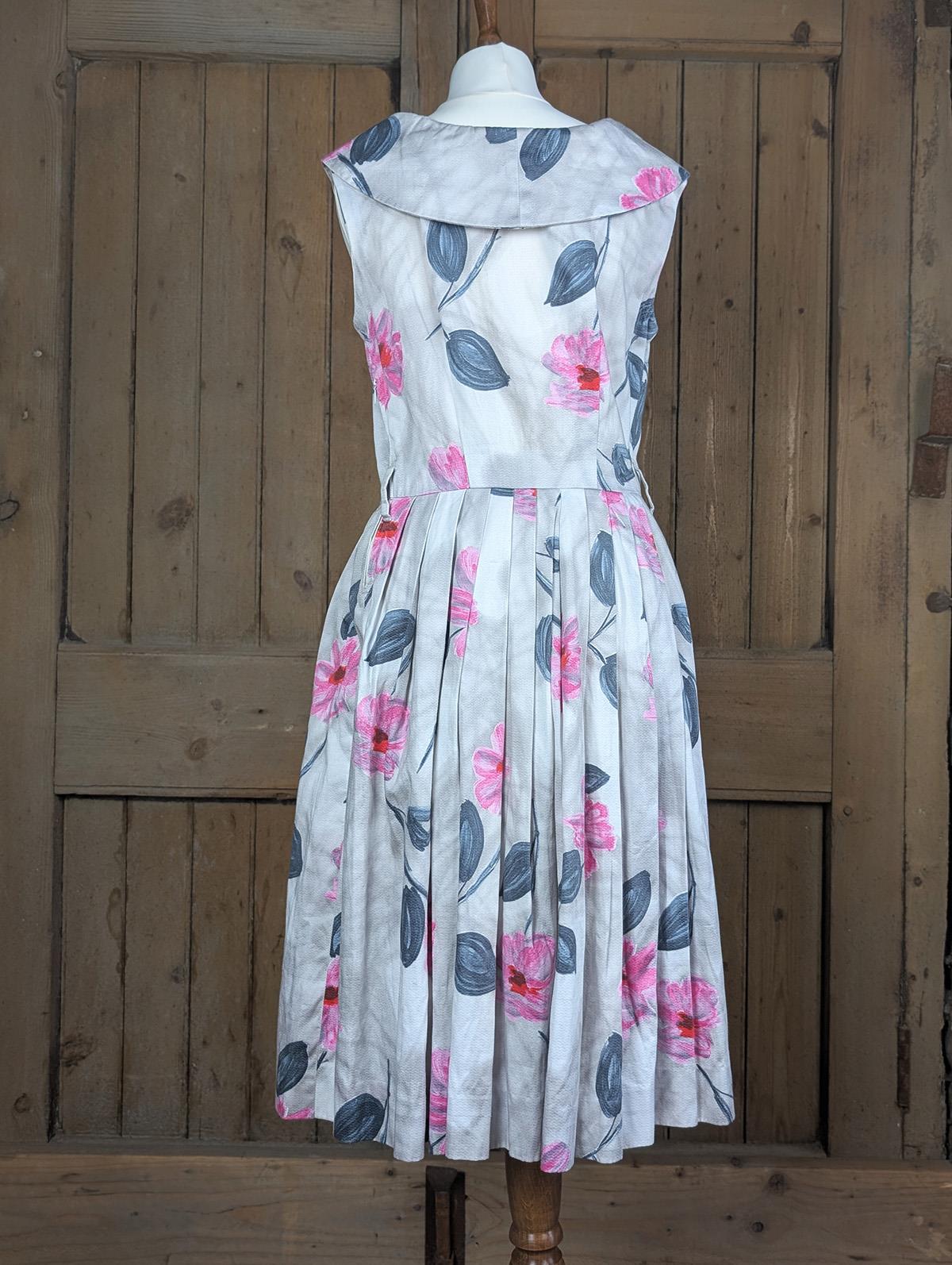 Genuine 50s day dress with a monochrome background to contrast beautifully with the large pink flower print.