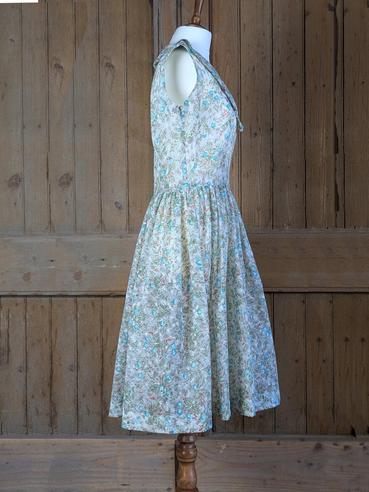 The dress's tie-neck collar also provides more detail, standing out from the neckline. The full skirt flares from the waist in a classic 50s style.