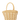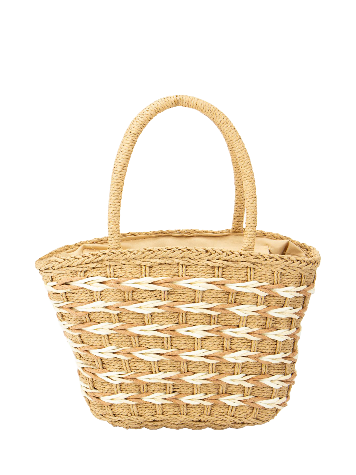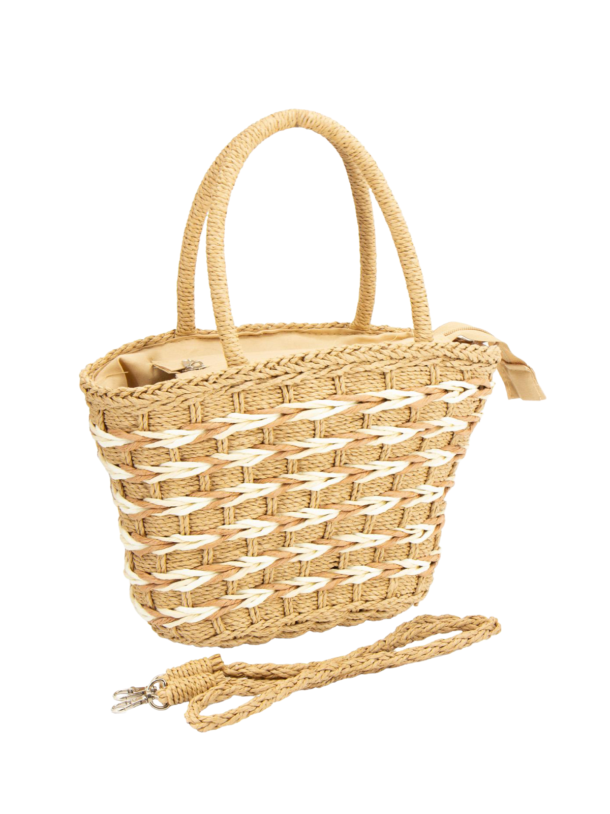 A compact woven straw bucket bag in a stylish brown, tan, and white weave. Designed with two top handles and a detachable long strap, it can be carried by hand or worn crossbody for versatility. The beige lining, zip fastening, and inside pocket keep your belongings safe while adding a polished finish. Perfect for summer trips to the beach or casual warm-weather outings.