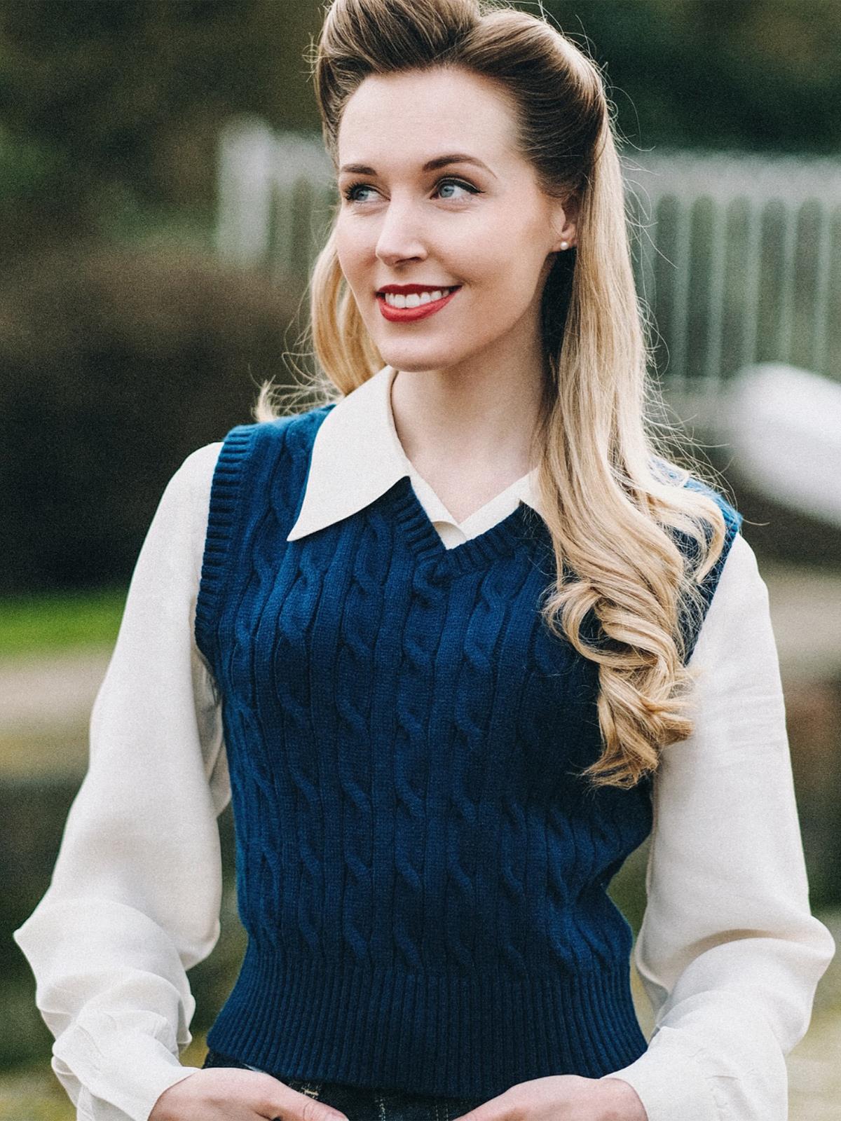 Vintage Style Cable Knit Tank Top -Navy Blue