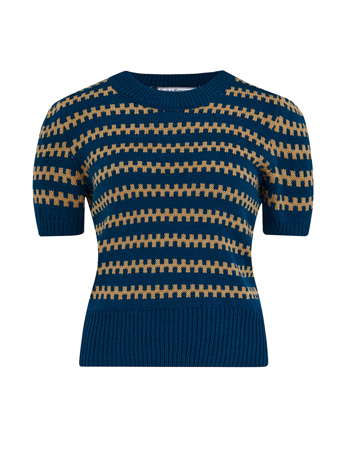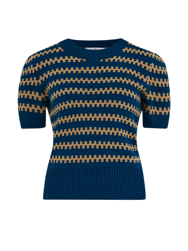 A classic peacock blue knit top, with stripe detail, perfect for 1940s and 50s inspired looks. Easy to style with jeans and flats for a relaxed outfit, or layer over vintage dresses. Pair with the matching cardigan to create a versatile twinset. Finished with small neck buttons for easy wear without disturbing your hairstyle.