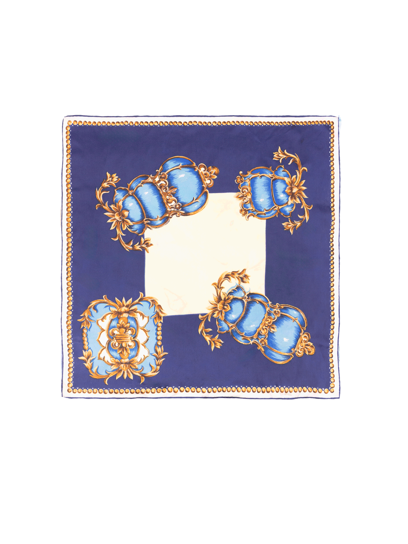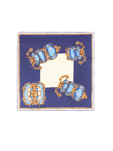 A classic vintage silk scarf in a sought after baroque pattern. Featuring a mix of tonal blues, gold, cream and white. The central square is cream / pale yellow, surrounded by navy blue with overlapping design, and bordered by a circular gold design. Hand rolled edges.
