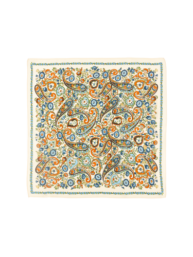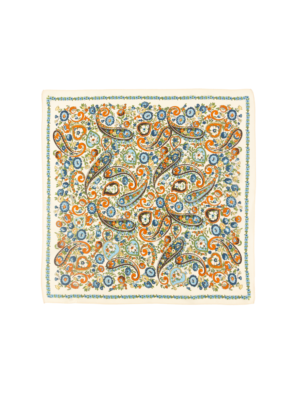 Square retro head scarf in a pure silk vibrant, multi-coloured paisley print on a cream background. The dense pattern incorporates rich tones of orange, teal, and blue, making it a stylish and eye catching accessory that can elevate any vintage or modern outfit.