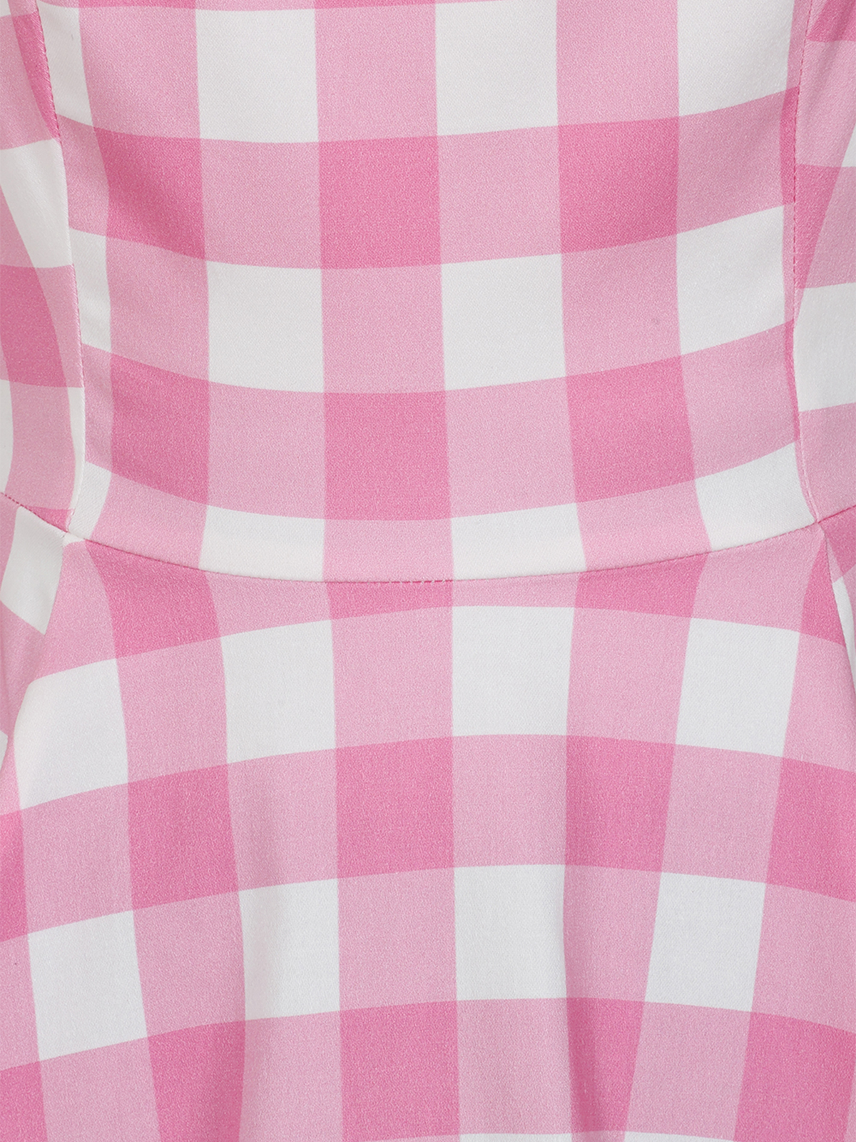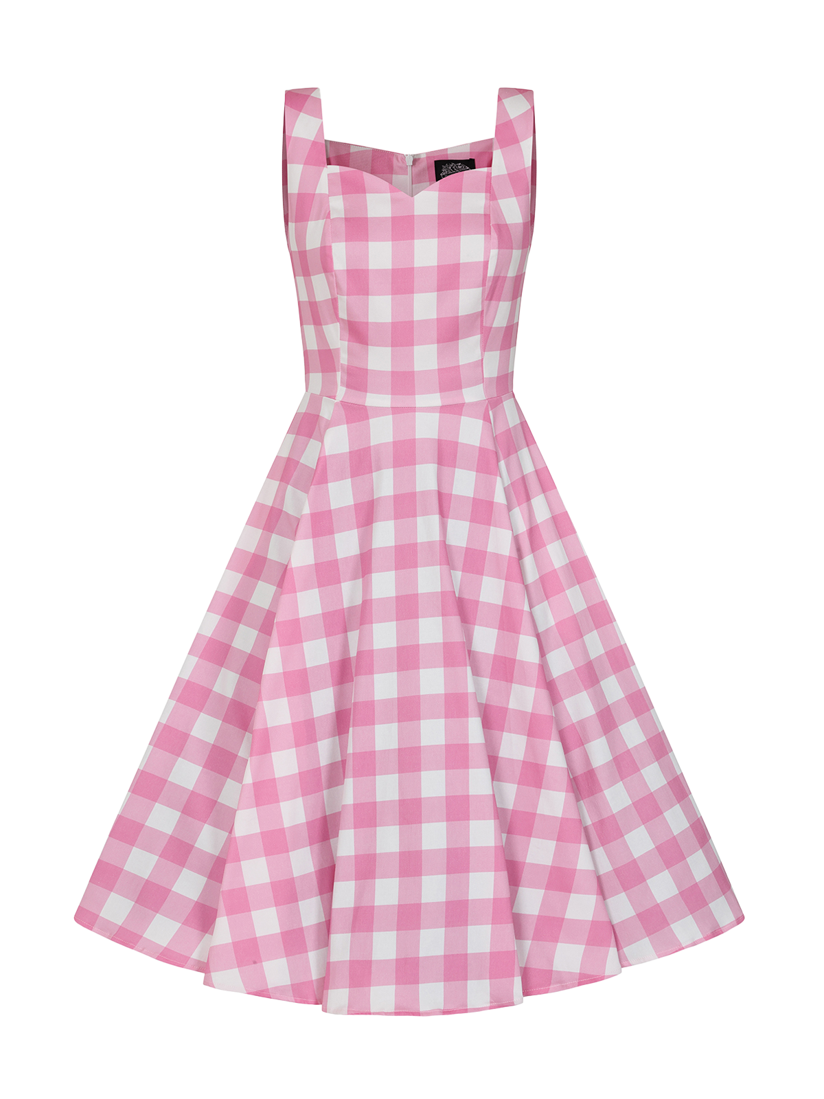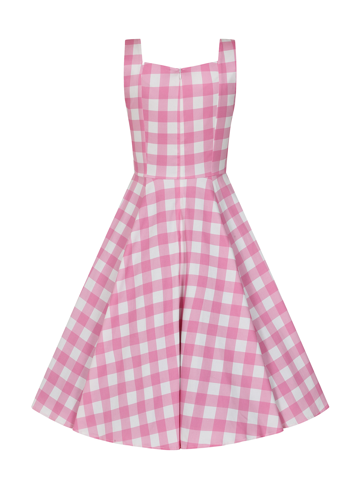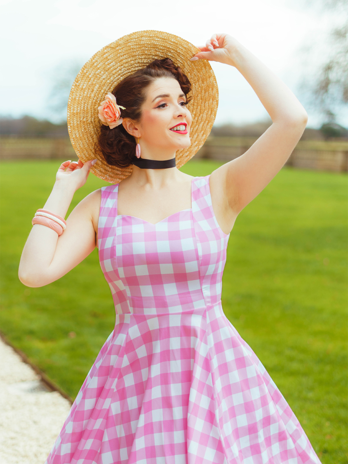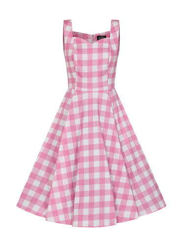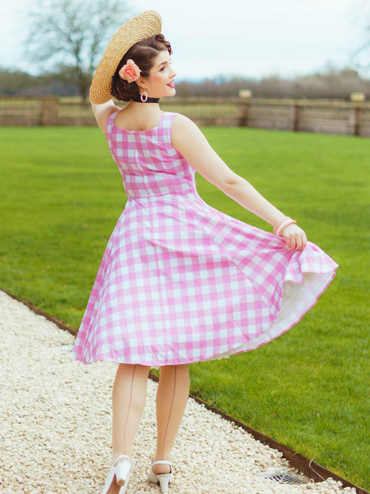 In a charming pink check, this timeless style features a sleeveless sweetheart bodice that cinches the waist and highlights your silhouette. The full 1950s inspired swing skirt creates graceful movement, perfect for sunshine and dancing! Add a tulle petticoat for extra volume.
