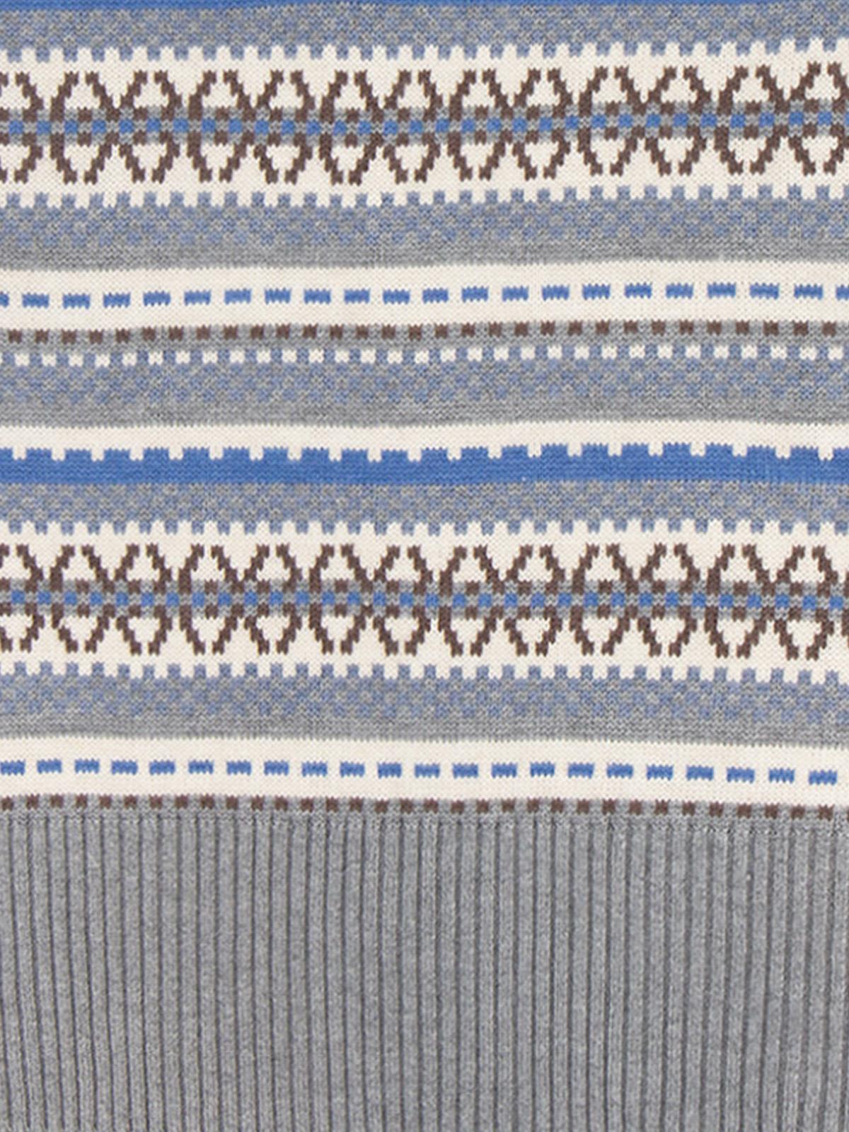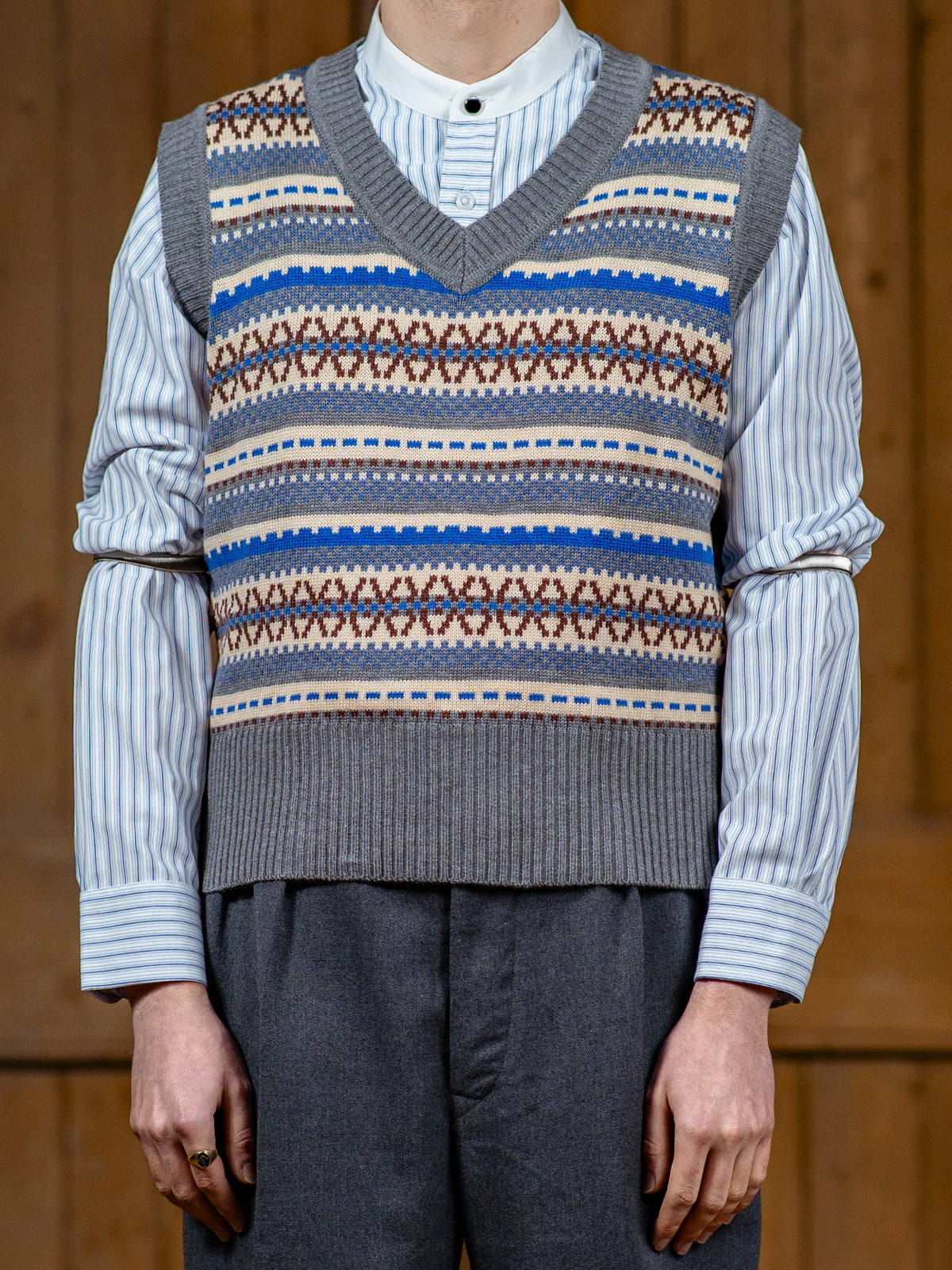 The Walter is a knitted tank top with an exclusive Fairisle pattern designed in-house and inspired by the 1940s; sure to be a classic piece for any retro wardrobe. The Chillin colourway is a cool-toned grey with blue, cream and warm brown accents.