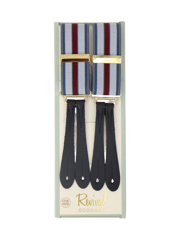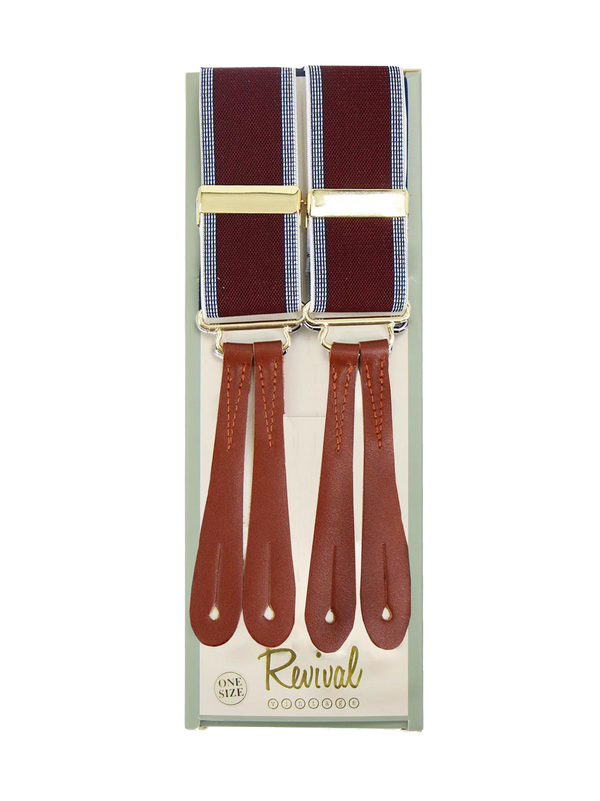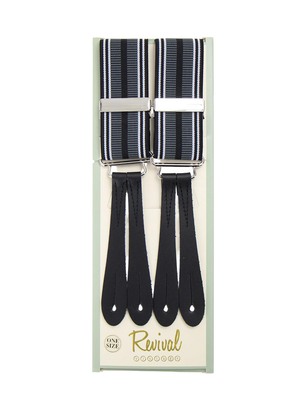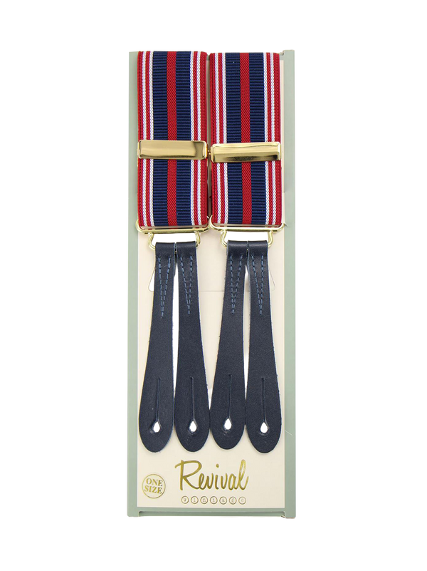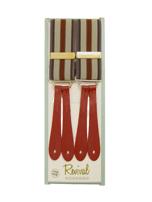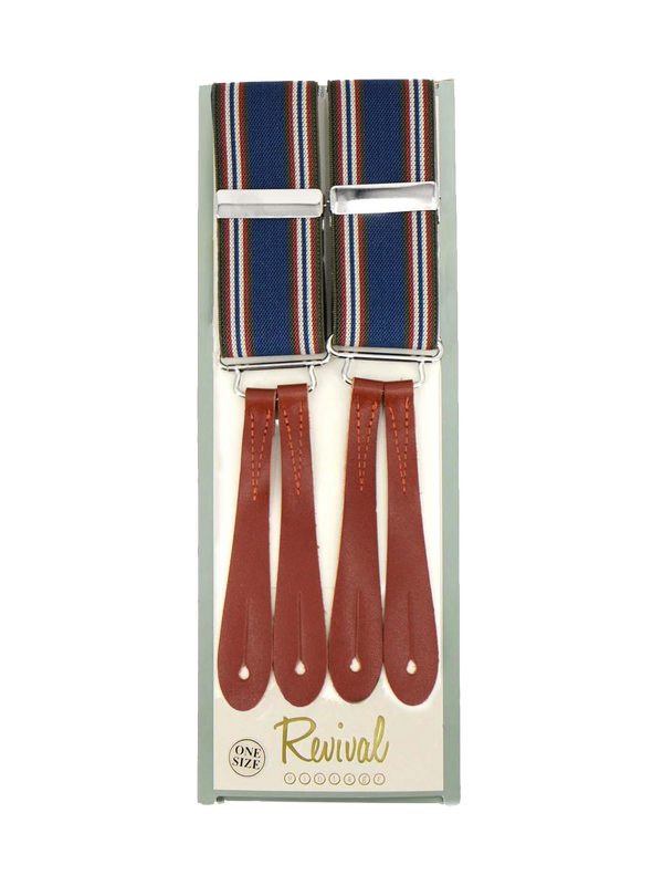 Vintage and Revival retro trouser braces come in many colours, stripes and patterns. We opt for traditional designs of the 40s 50s and 60s. Metal clips are easily attached to any vintage trousers but leather loop styles are essential to give you an authentic mid-century look.