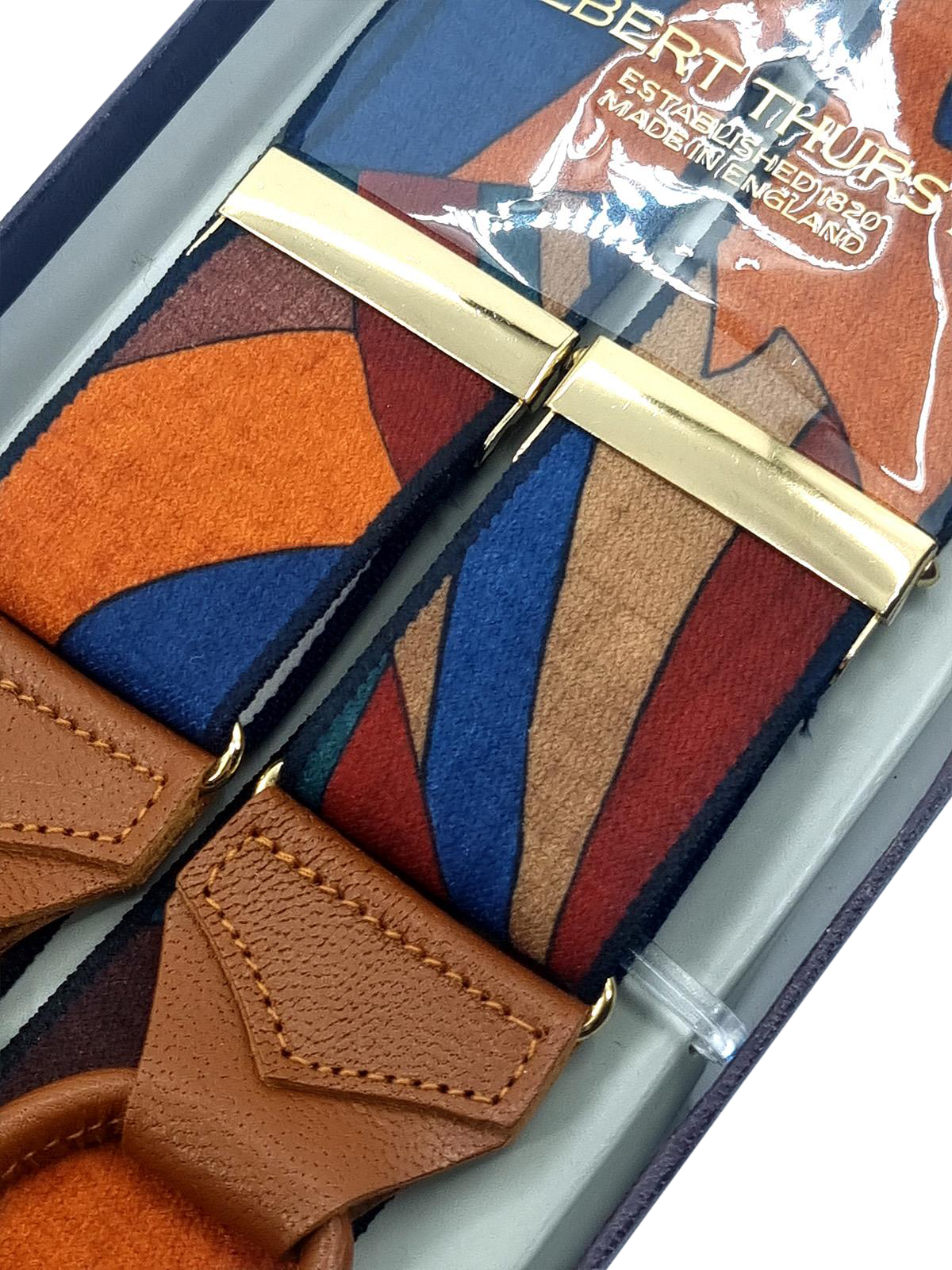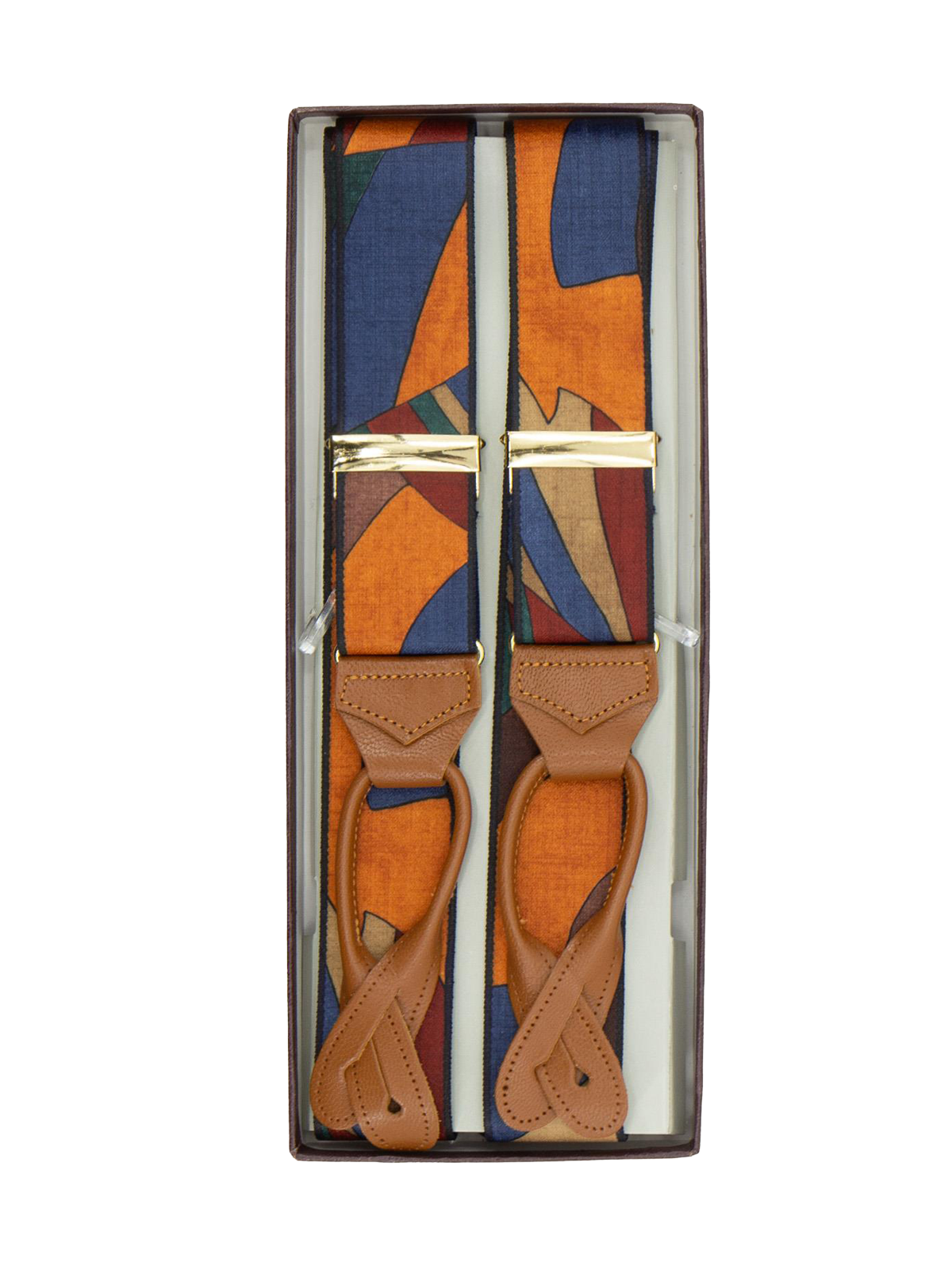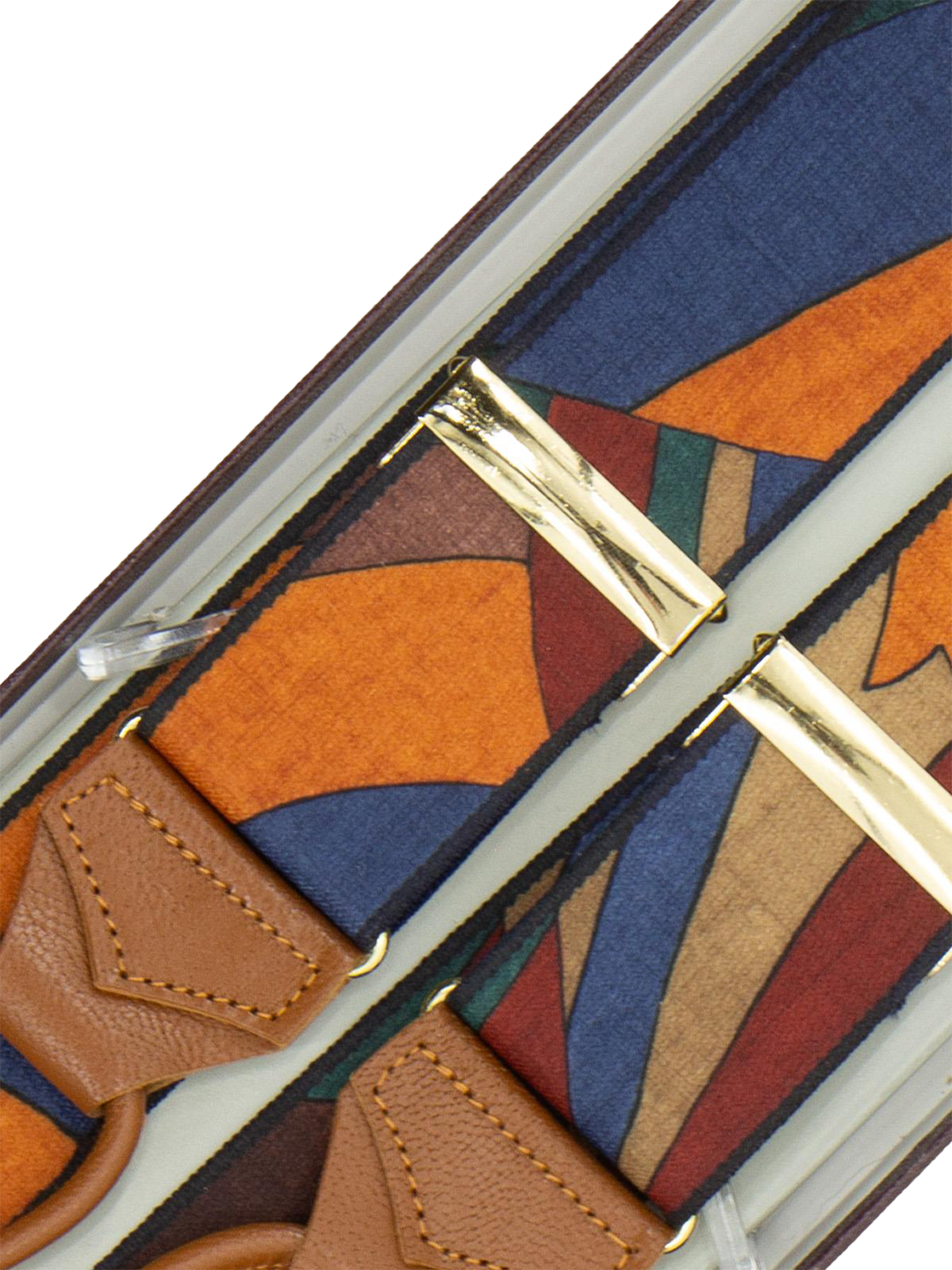 Handmade high quality deadstock trouser braces in an artistic abstract pattern of blue, orange, red, and green, finished with tan leather loops for attaching to trouser waist buttons. They are adjustable with brass fittings and cut in a classic ‘Y’ back design.