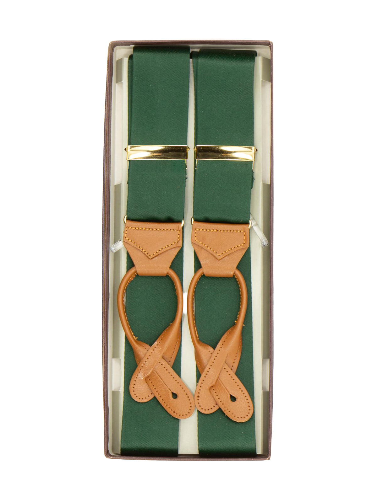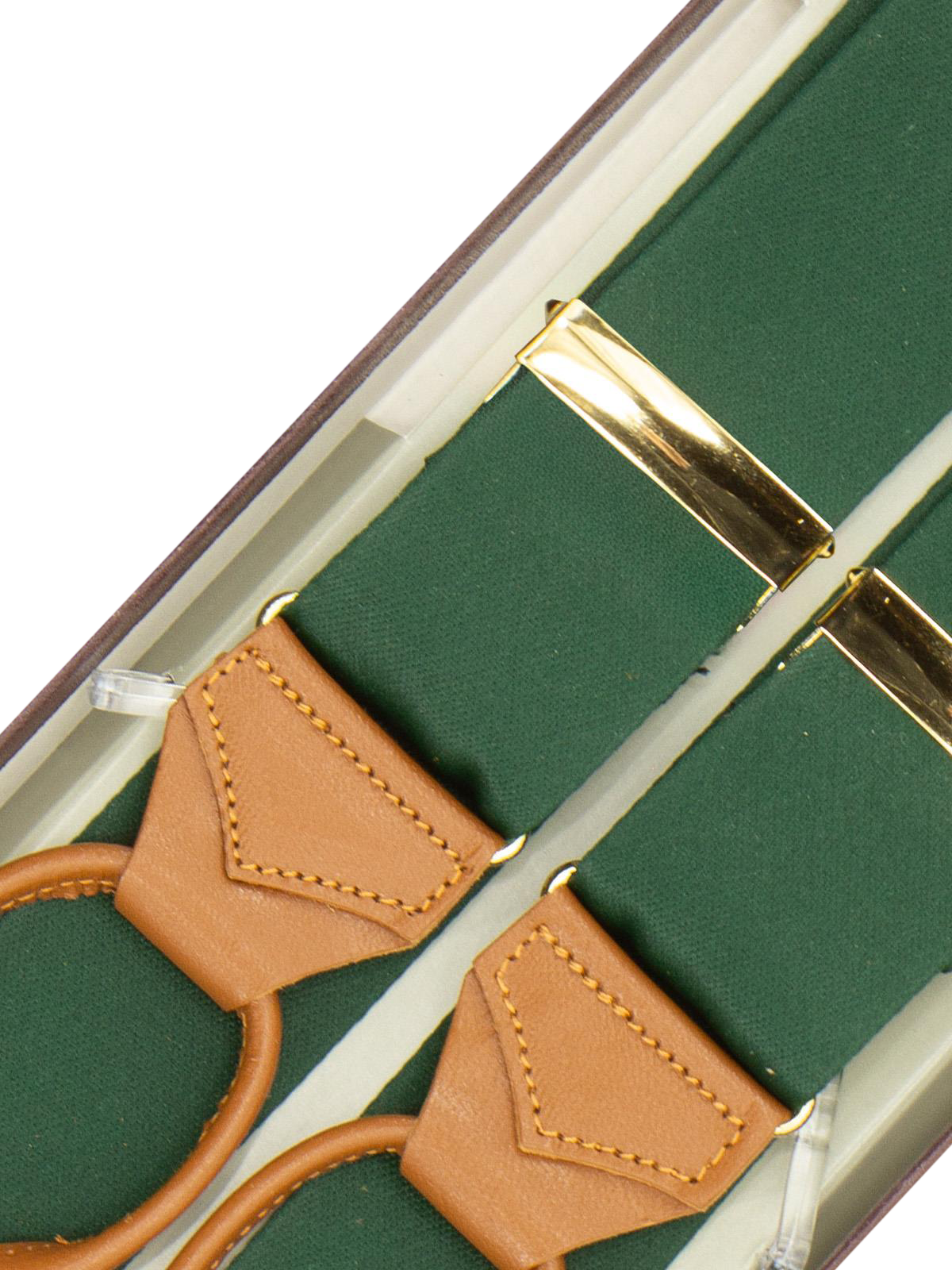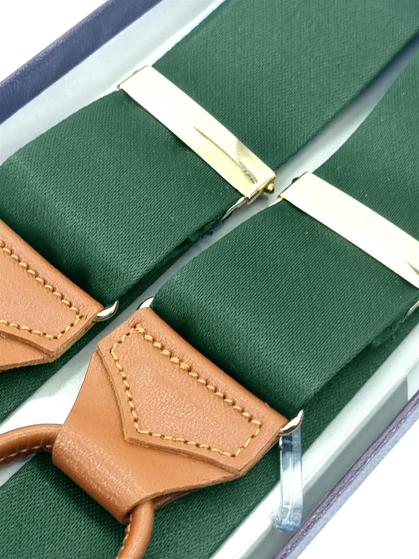 Handmade high quality deadstock trouser braces in elegant plain woven green fabric, finished with tan leather loops for attaching to trouser waist buttons. Meticulously handmade and fitted with brass adjusters, they feature a timeless ‘Y’ back design.