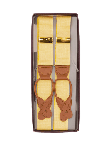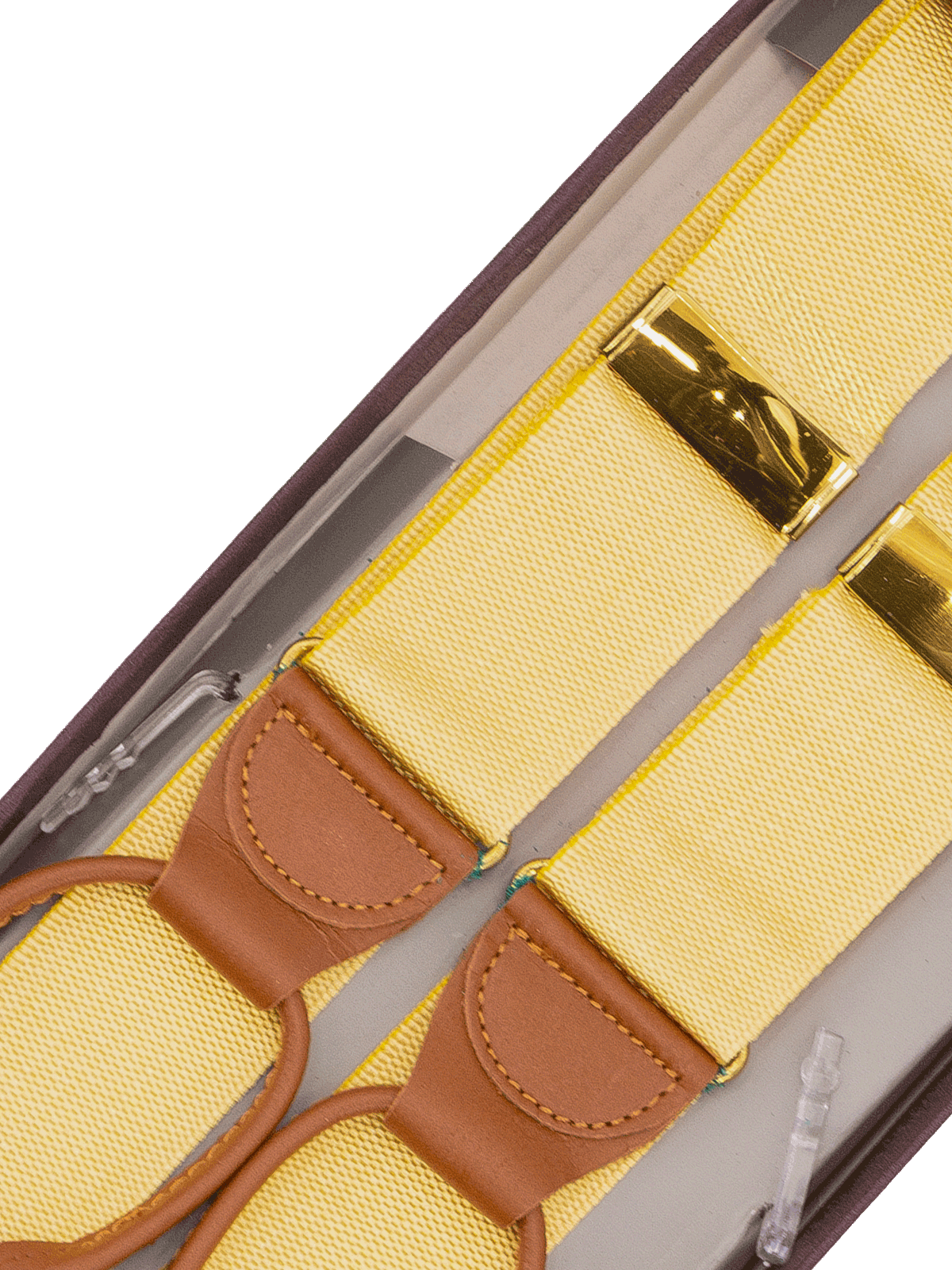 Handcrafted deadstock trouser braces in a distinctive yellow woven fabric, finished with sleek tan polished leather loops for fastening to trouser waist buttons. Expertly handmade and fitted with adjustable brass fittings for a refined, comfortable fit, they feature a classic ‘Y’ back construction.