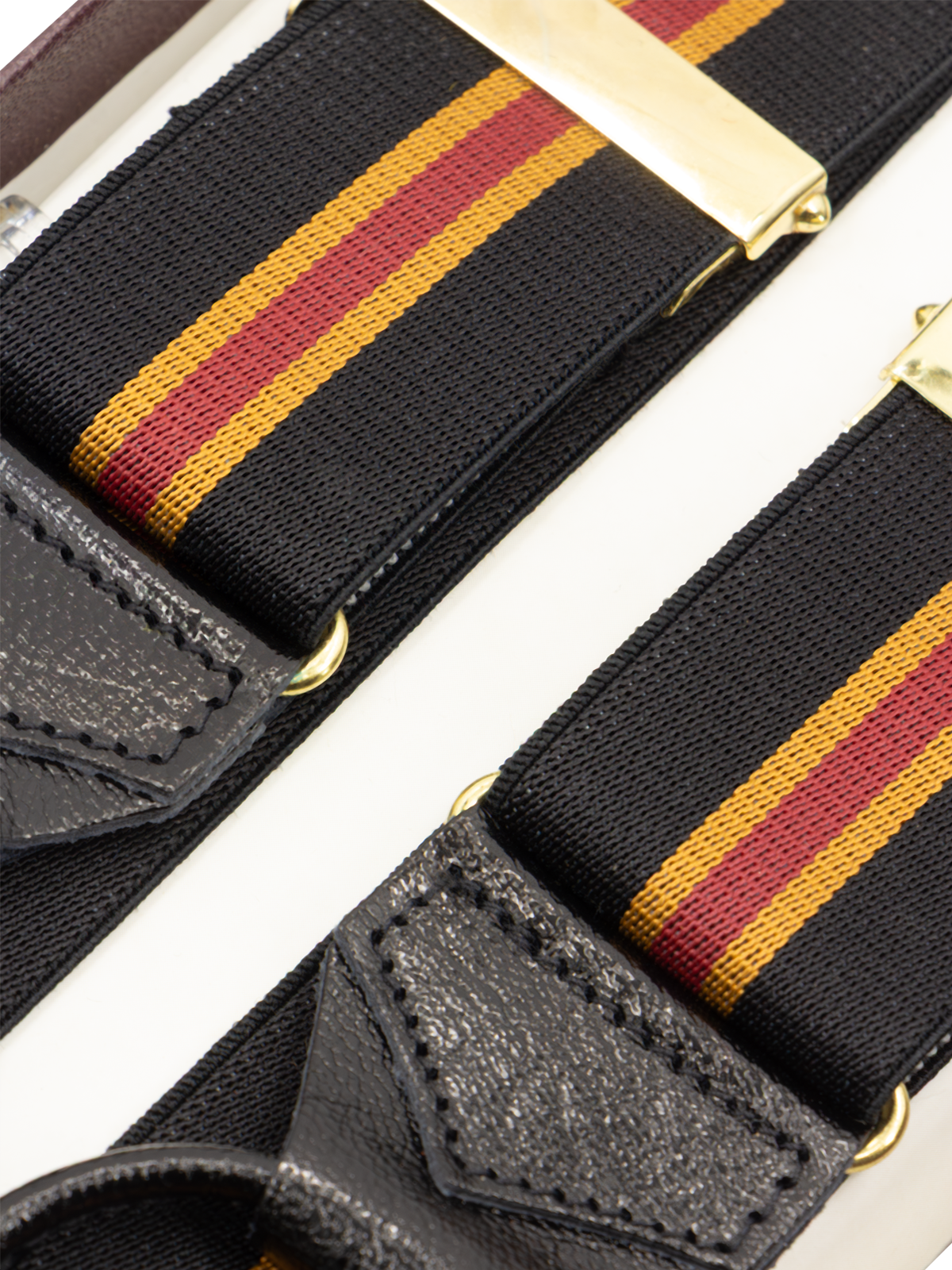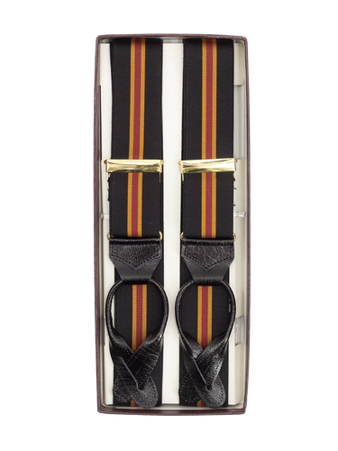 Handcrafted deadstock trouser braces, in a classic black regimental striped fabric featuring bold red and gold accents. Finished with sleek black leather loops for fastening to trouser waist buttons. Expertly handmade and fitted with adjustable brass fittings for a comfortable fit, they feature a classic ‘Y’ back construction.