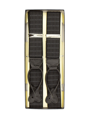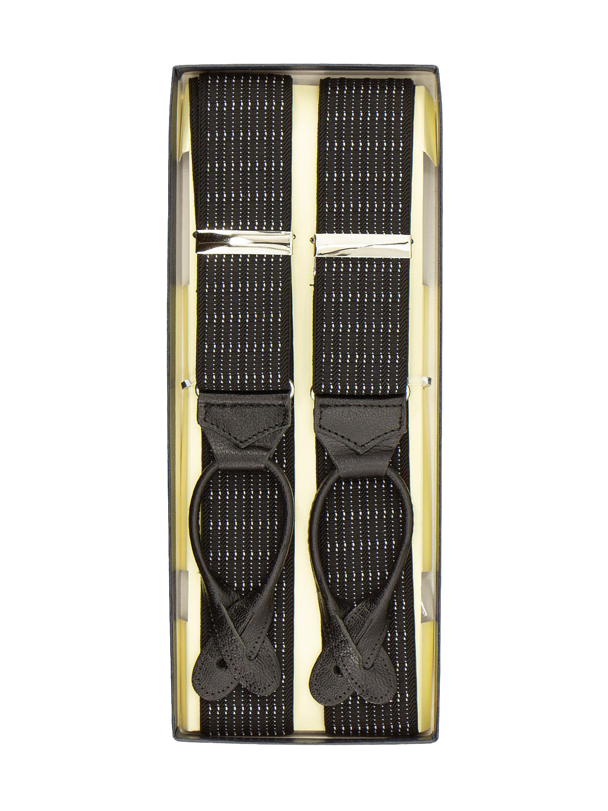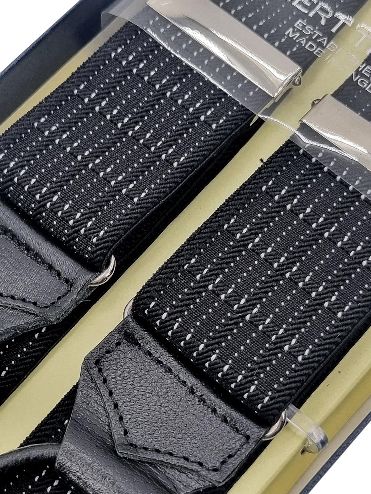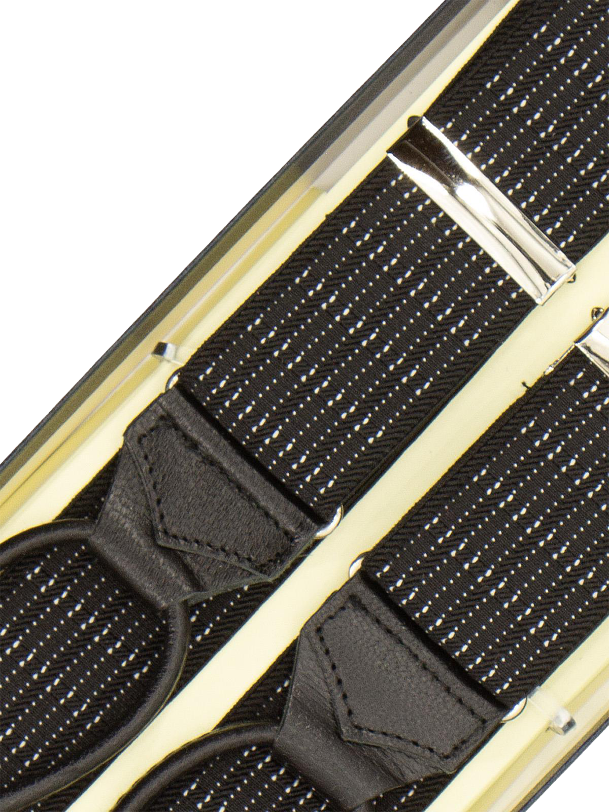 Handmade high quality deadstock trouser braces in black woven fabric with a white dotted stripe pattern, finished with leather loops for attaching to trouser waist buttons. Adjustable with silver fittings, they are cut in a classic ‘Y’ back design.