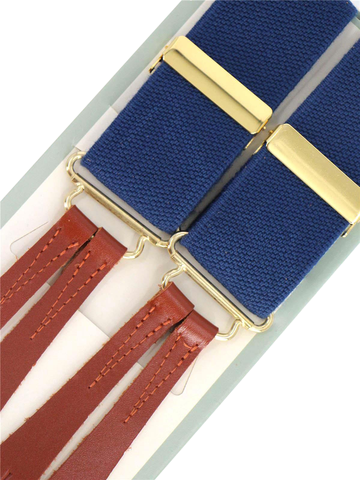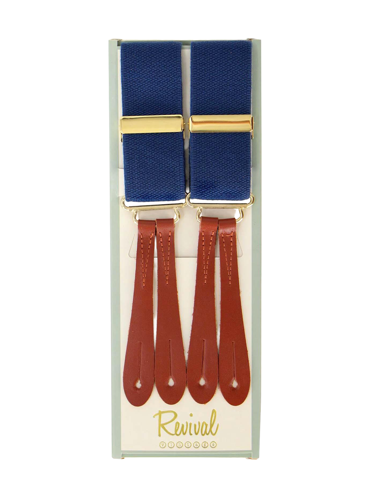 Handmade high quality vintage style trouser braces in blue, finished with tan leather loops for attaching to trouser waist buttons. Designed to complement RAF uniforms, they are elasticated for comfort and flexibility, adjustable with gold gilt closures, and cut in a classic ‘Y’ back design.