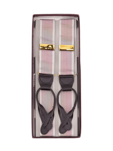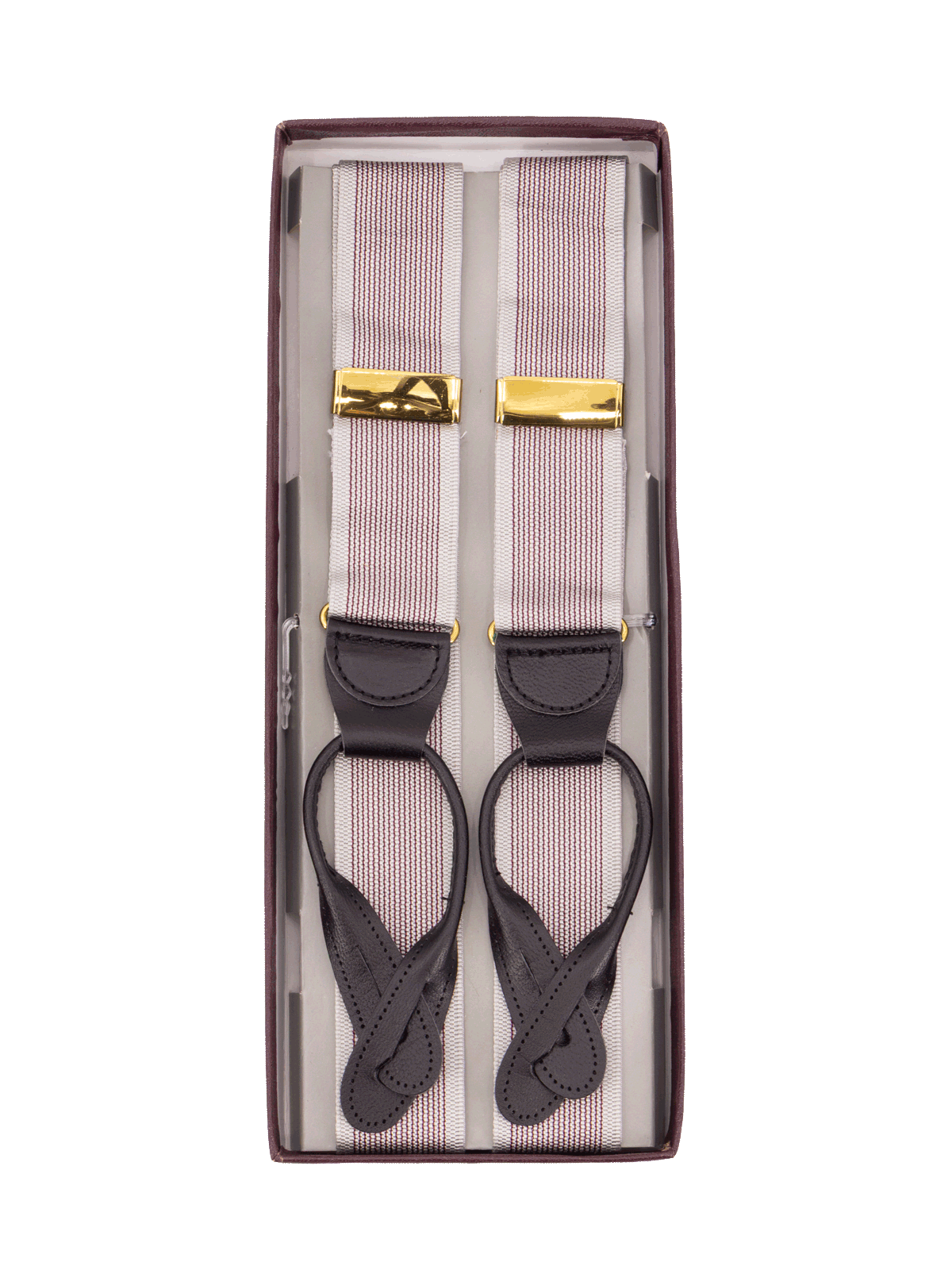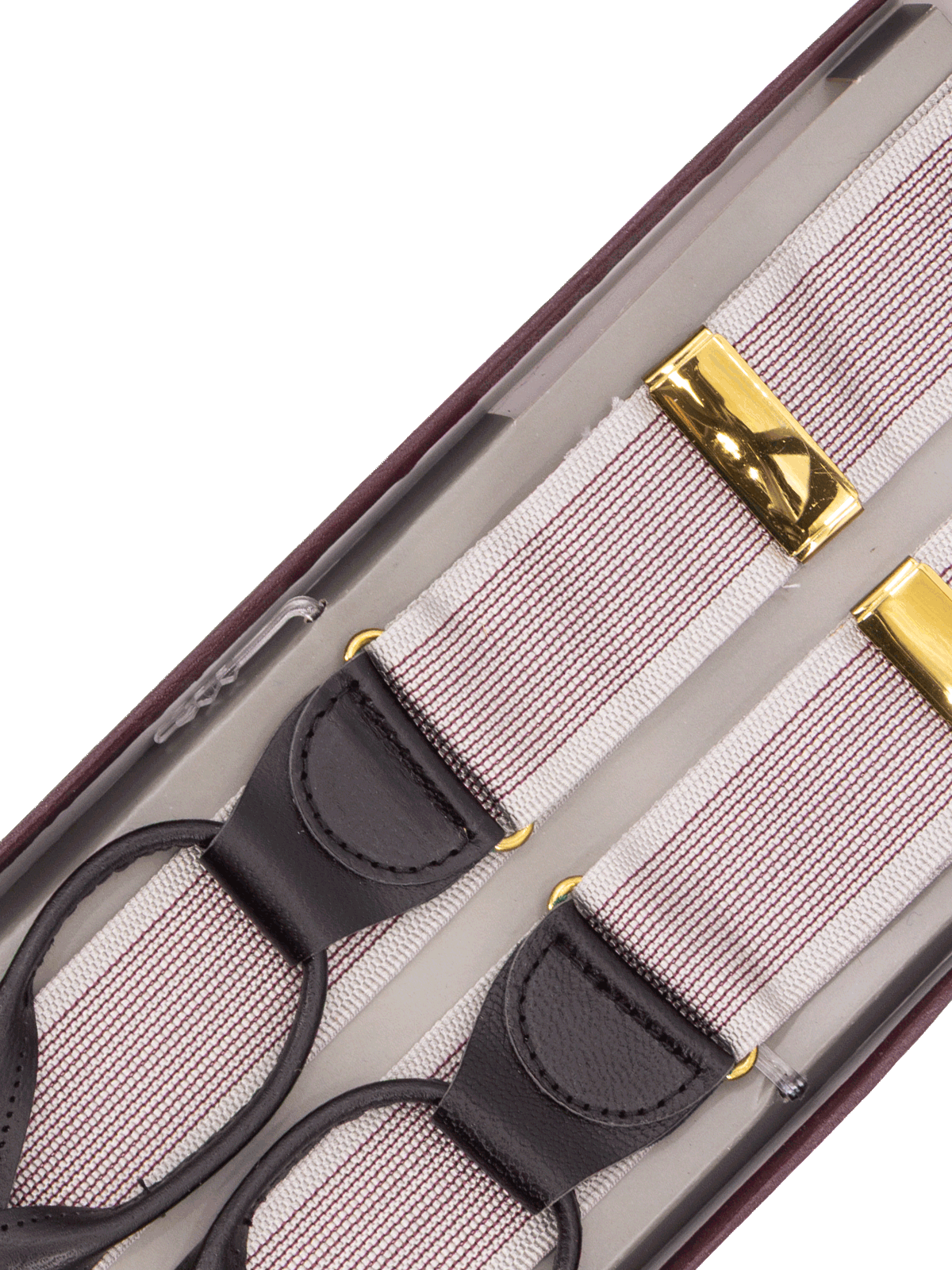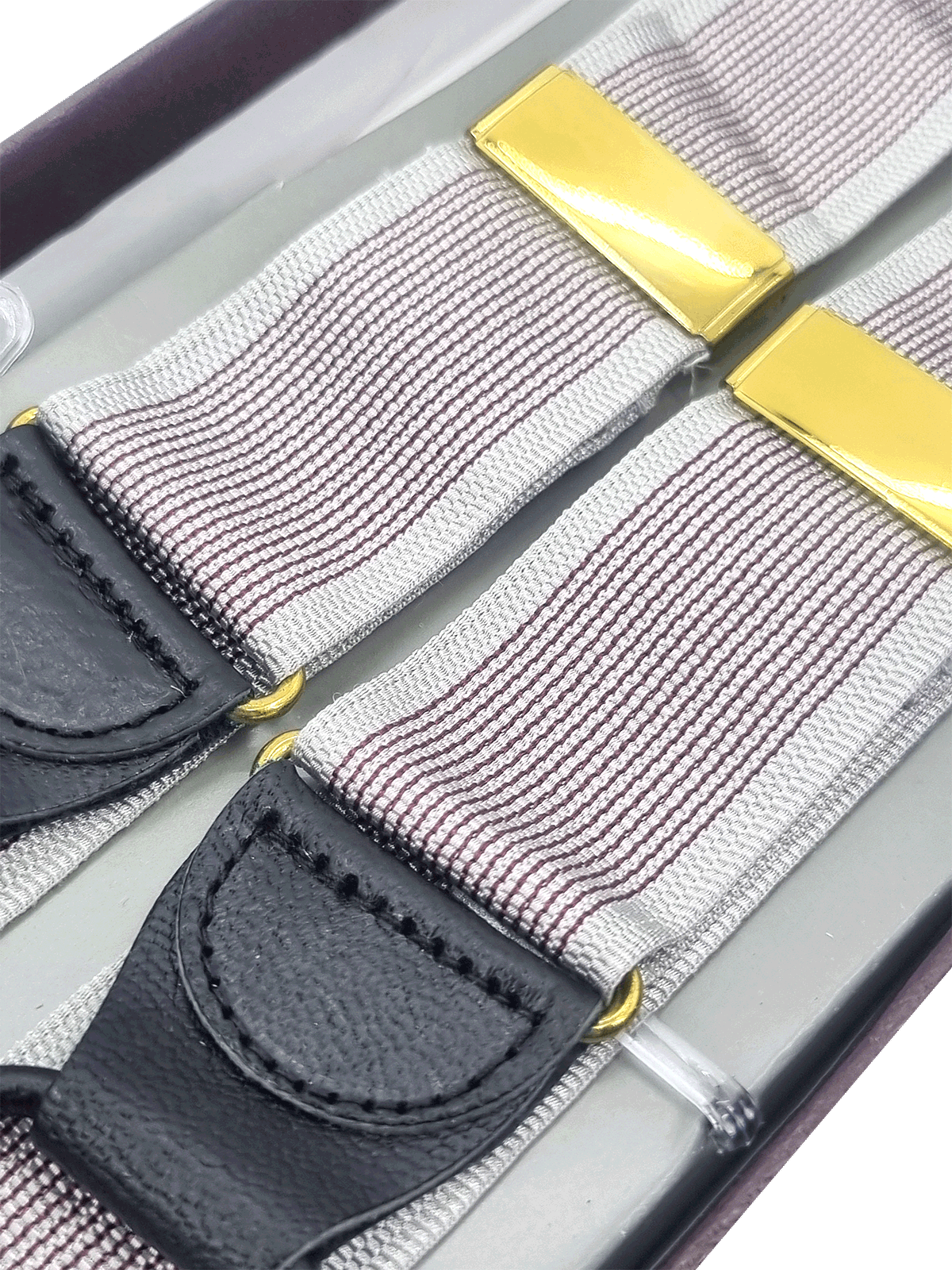 Handcrafted deadstock trouser braces in a sophisticated burgundy and silver woven fabric, finished with sleek black leather loops for fastening to trouser waist buttons. Expertly handmade and fitted with adjustable brass fittings for a refined, comfortable fit, they feature a classic ‘Y’ back construction.