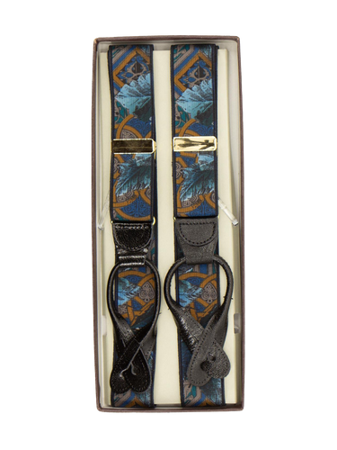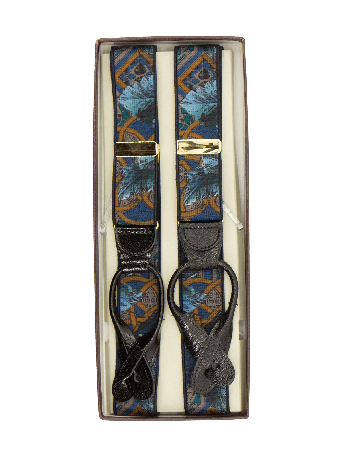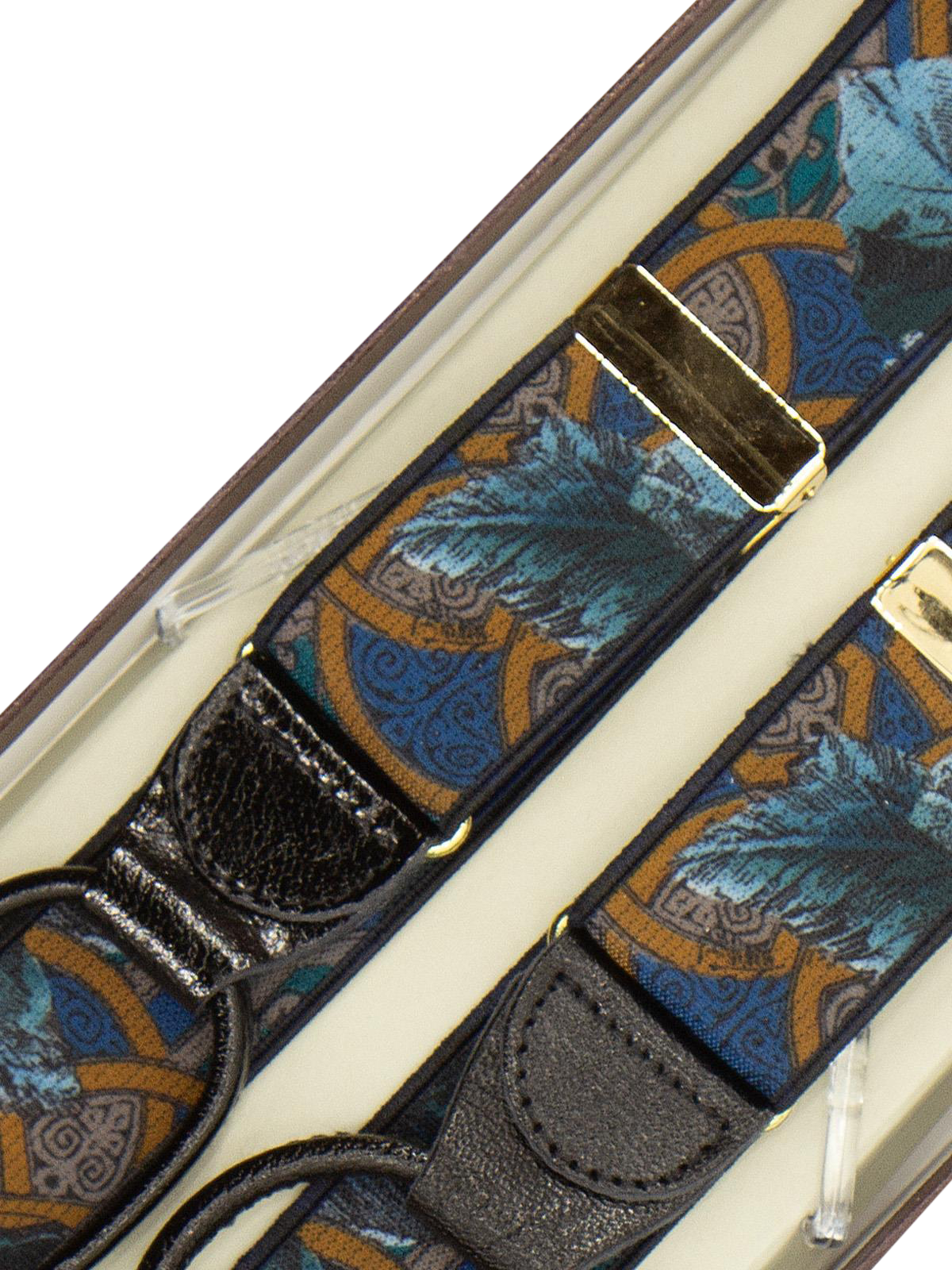 Handcrafted deadstock trouser braces in a distinctive watercolour style celtic pattern with leaves, finished with real goat skin leather loops for fastening to trouser waist buttons. Expertly handmade and fitted with adjustable brass fittings for a refined, comfortable fit, they feature a classic ‘Y’ back construction.