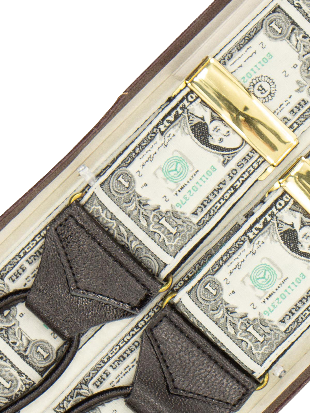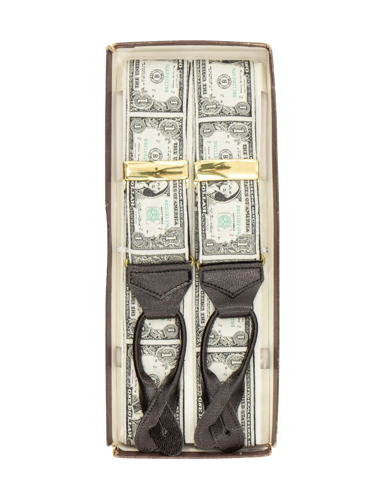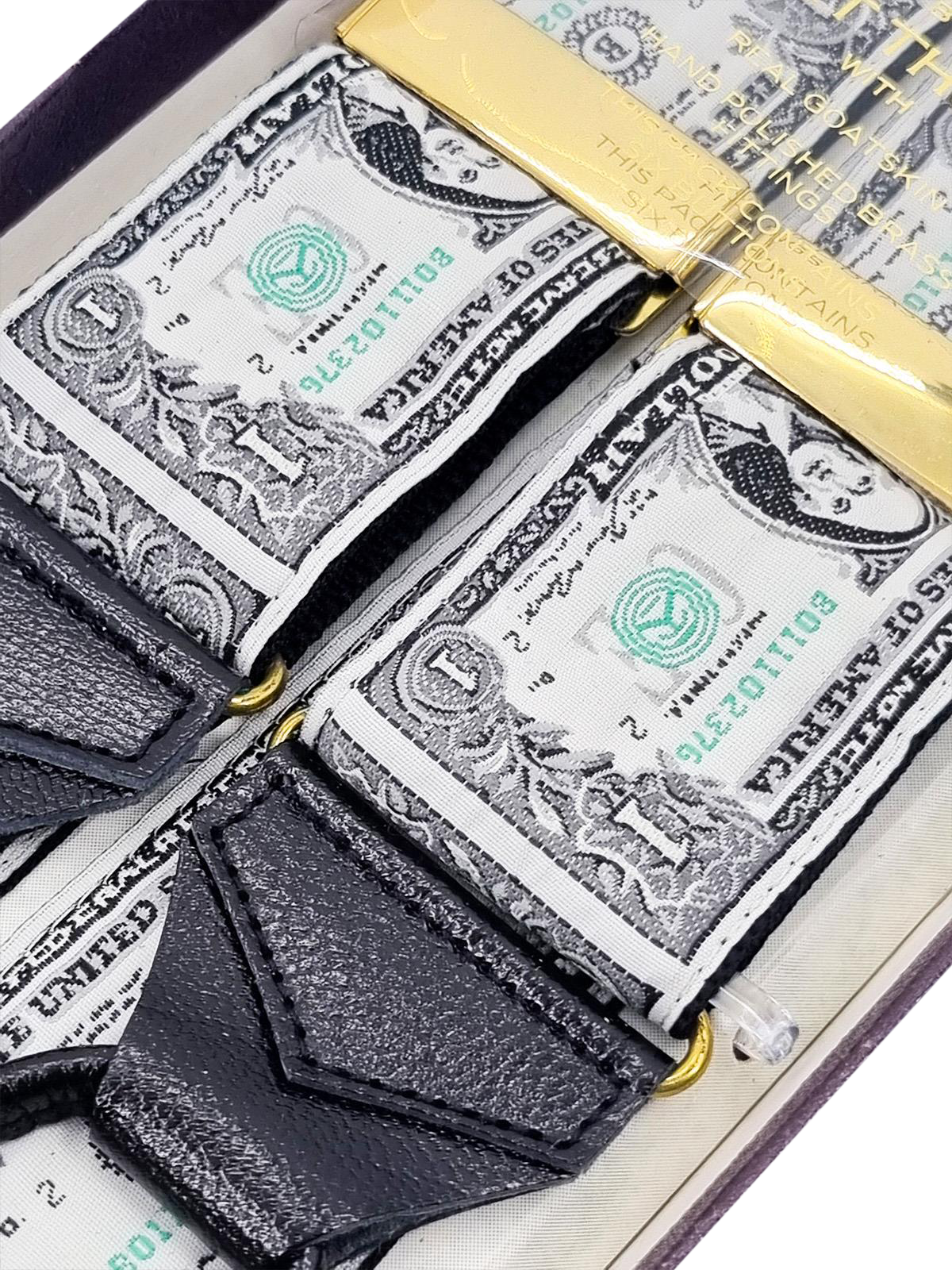 Handmade high quality deadstock trouser braces with a repeating dollar motif, finished with polished black leather loops for attaching to trouser waist buttons. Adjustable with brass fittings, they are cut in a traditional ‘Y’ back design.