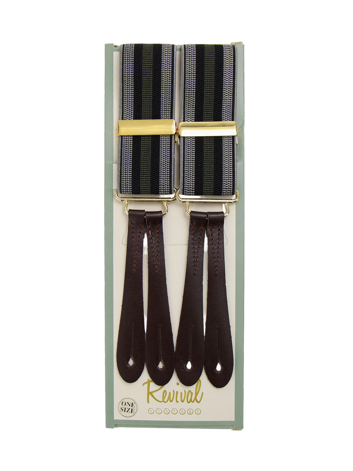 Handcrafted deadstock trouser braces in a distinctive khaki green and grey stripe, finished with dark brown leather loops for fastening to trouser waist buttons. Expertly handmade in Huddersfield, England, and fitted with adjustable gold gilt closures for a refined, comfortable fit, they feature a classic ‘Y’ back construction.