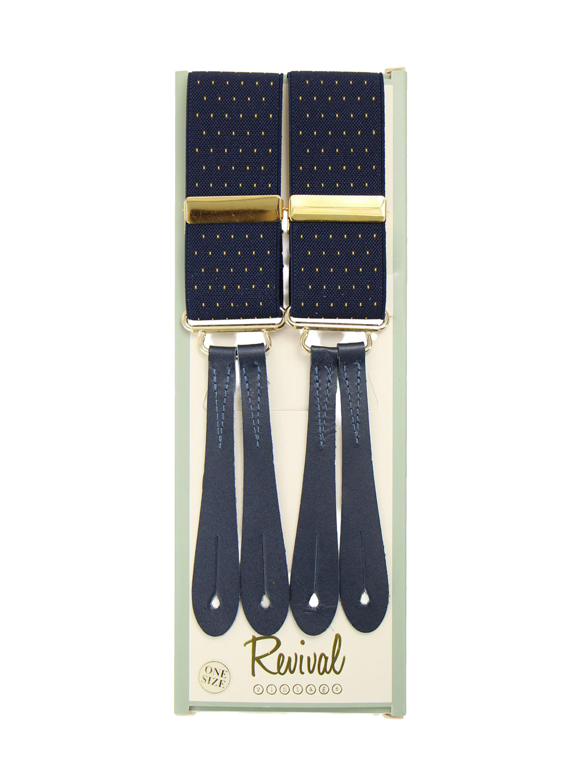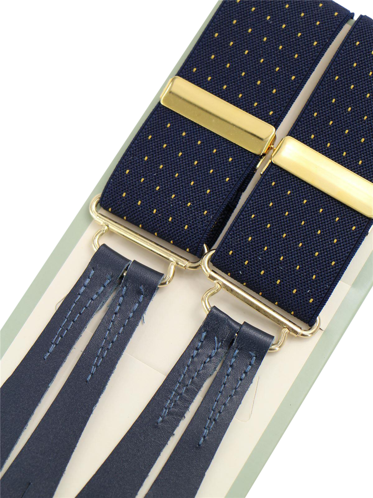 Handmade high quality vintage style trouser braces in navy blue with a gold pin spot design, finished with navy leather loops for attaching to trouser waist buttons. Elasticated for comfort and flexibility, they are adjustable with gold gilt closures and cut in a classic ‘Y’ back design.
