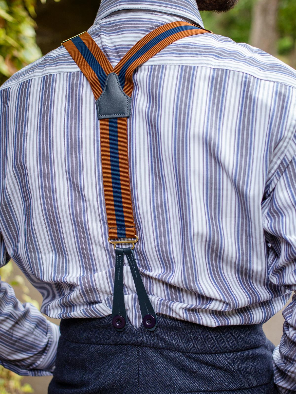 Rust orange and navy blue stripe, with navy leather loops to attach to trousers with waist buttons.