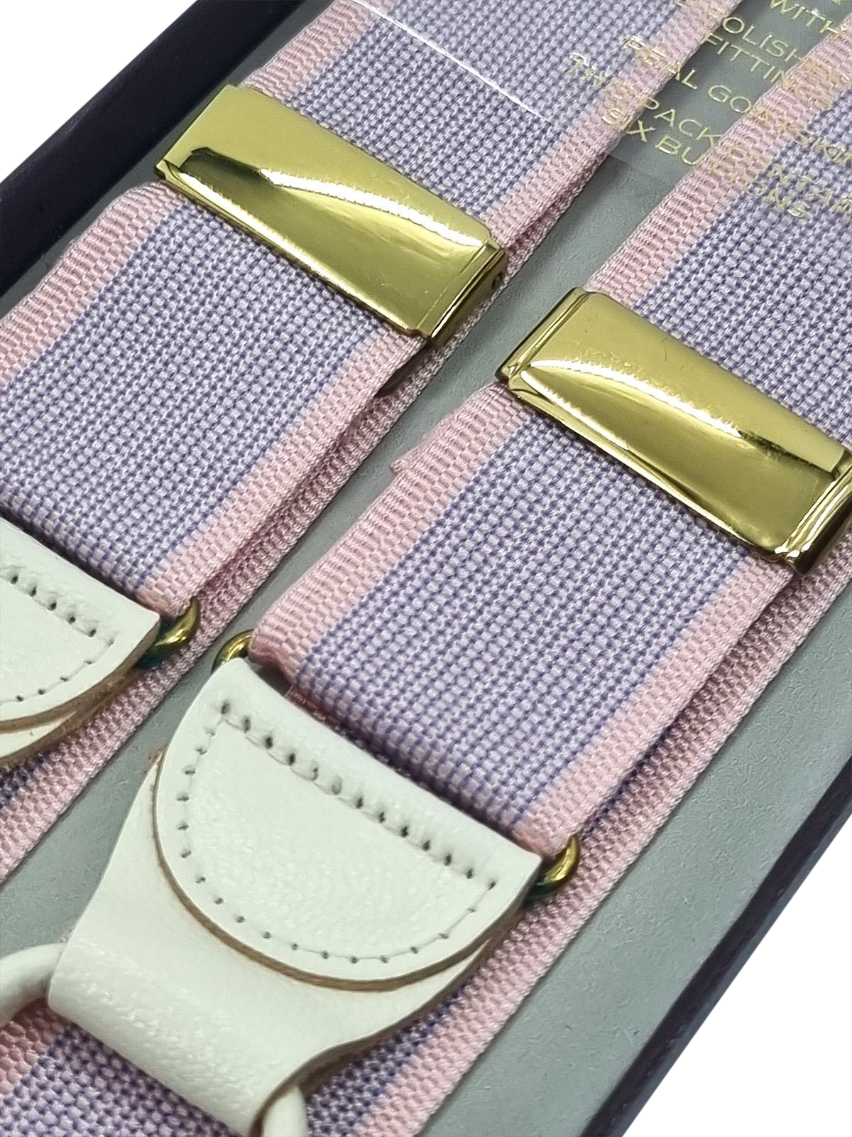 Handmade high quality deadstock trouser braces in pink and purple striped silk fabric, finished with leather loops for attaching to trouser waist buttons. Elasticated for comfort and flexibility, they are adjustable with brass fittings and cut in a classic ‘Y’ back design.