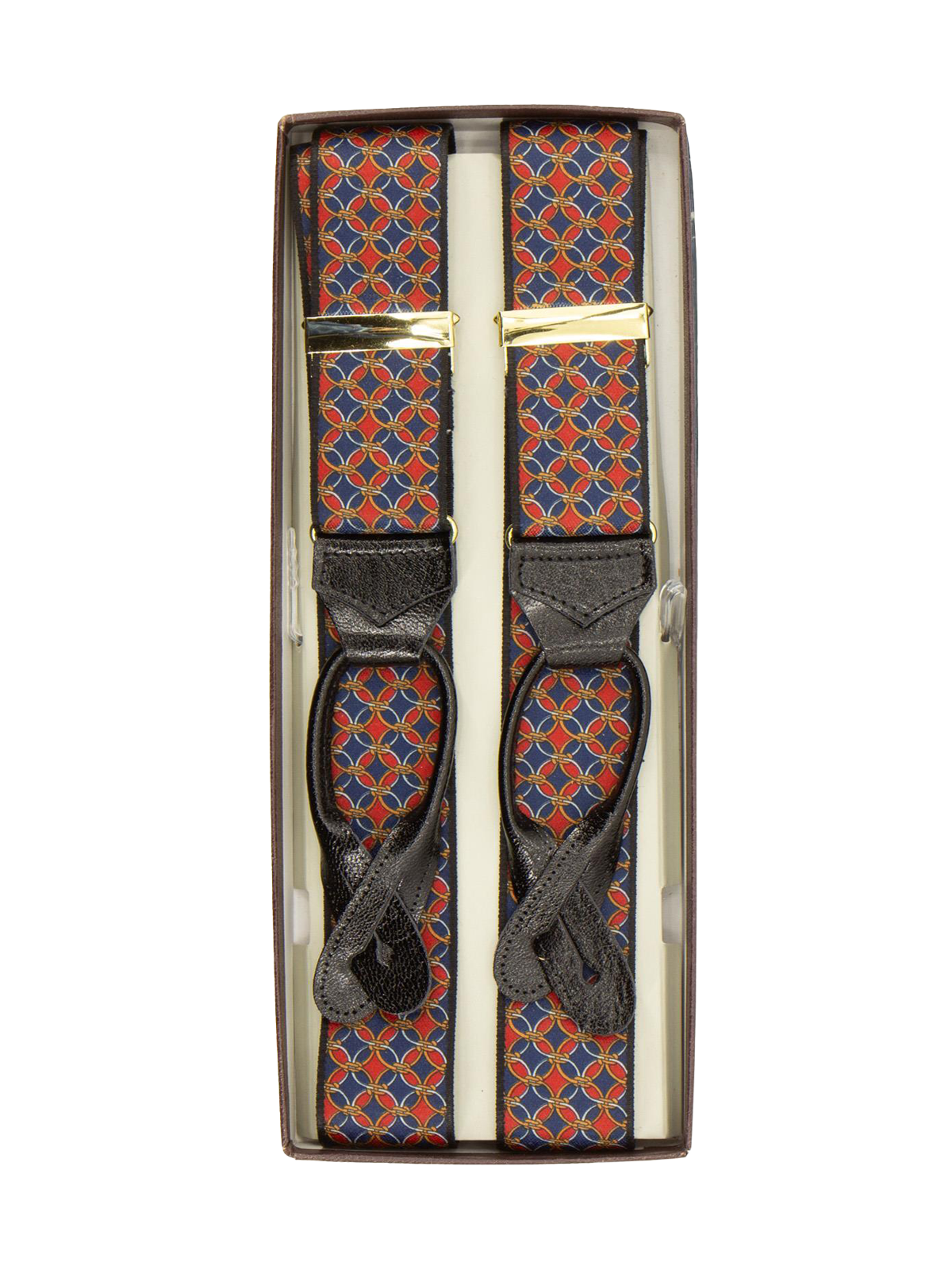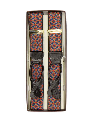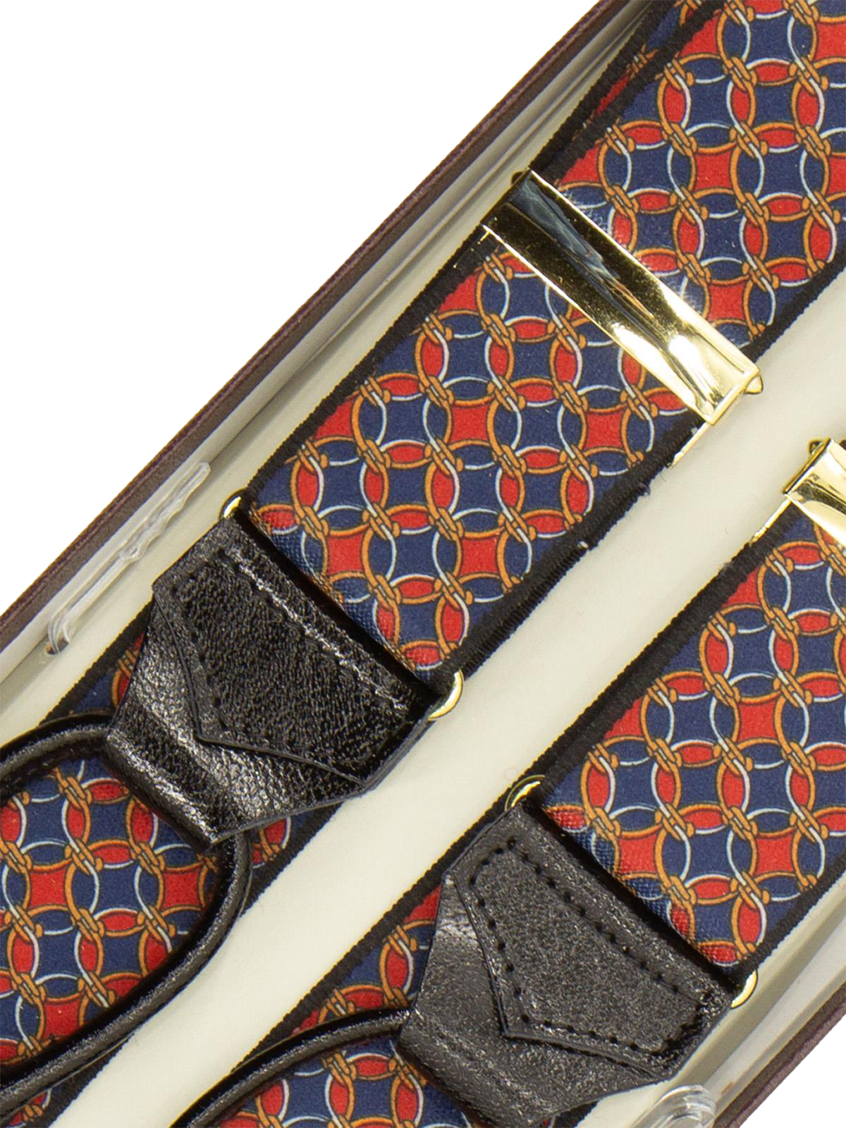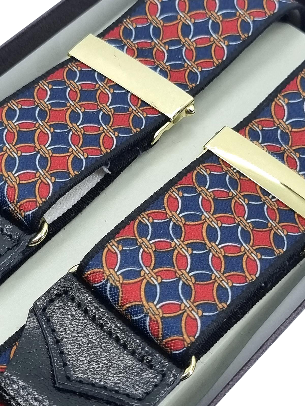 Handmade high quality deadstock trouser braces in red and blue chain link patterned fabric, finished with leather loops for attaching to trouser waist buttons. Elasticated for comfort and flexibility, they are adjustable with brass fittings and cut in a classic ‘Y’ back design.