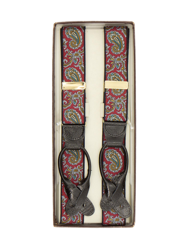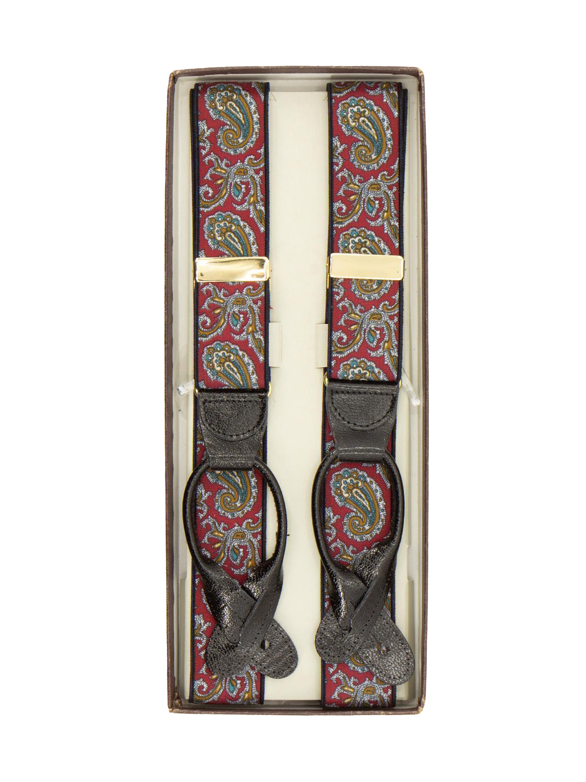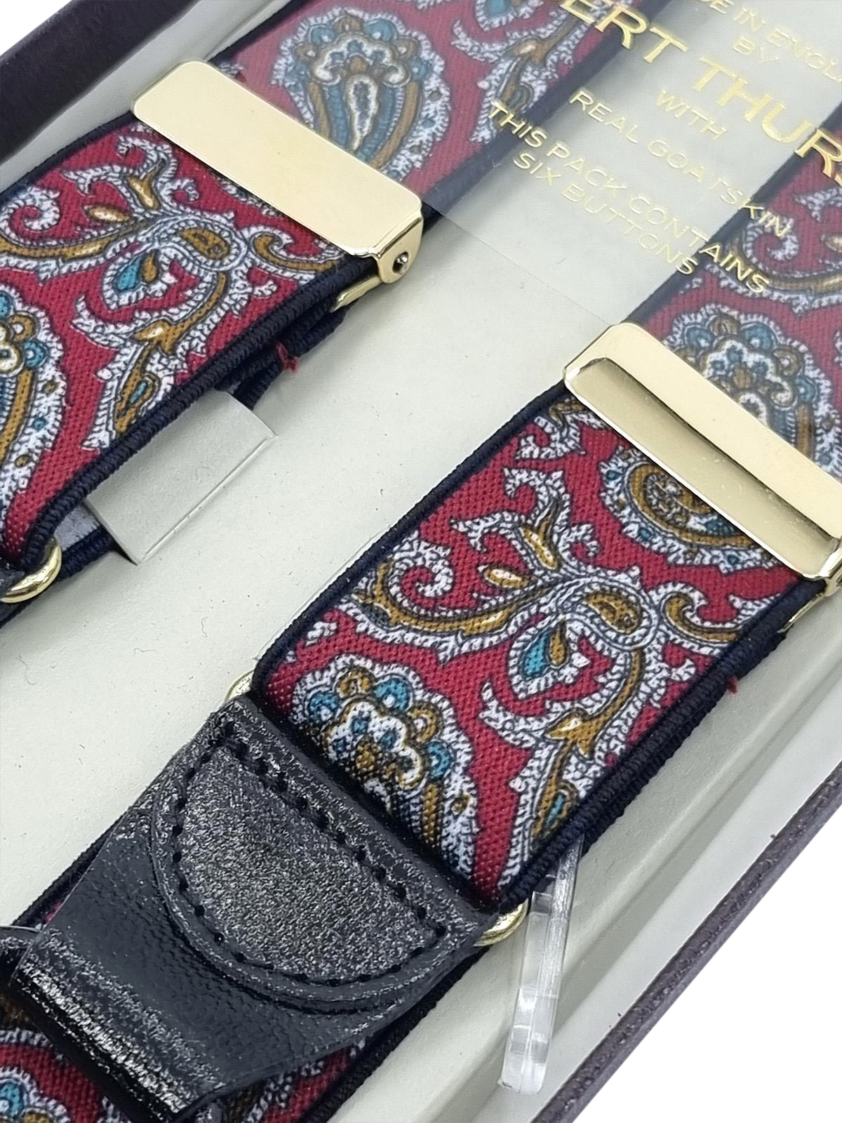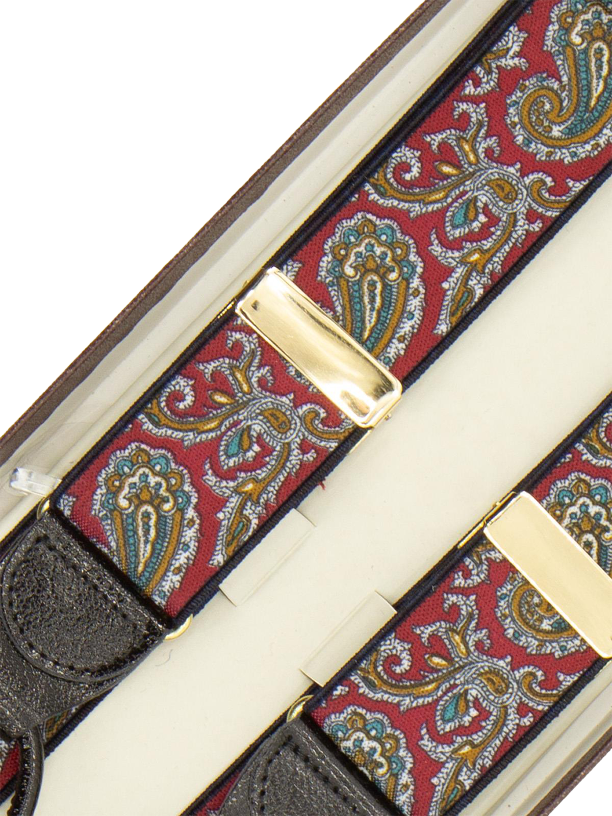 Handcrafted deadstock trouser braces in a distinctive paisley pattern design on a red background, finished with leather loops for fastening to trouser waist buttons. Expertly handmade and fitted with adjustable brass fittings for a refined, comfortable fit, they feature a classic ‘Y’ back construction.