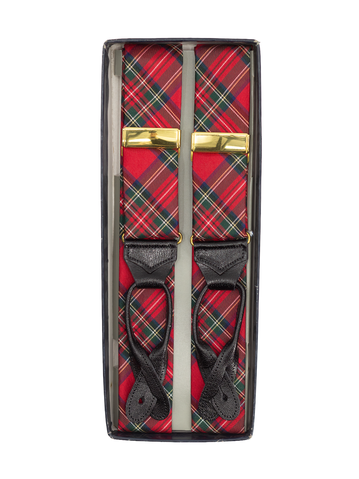 Handcrafted deadstock trouser braces in a classic red tartan, finished with sleek black leather loops for fastening to trouser waist buttons. Expertly handmade and fitted with adjustable gold tone fittings for a comfortable fit, they feature a classic ‘Y’ back construction.