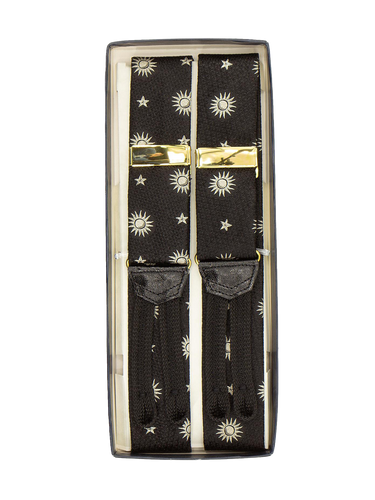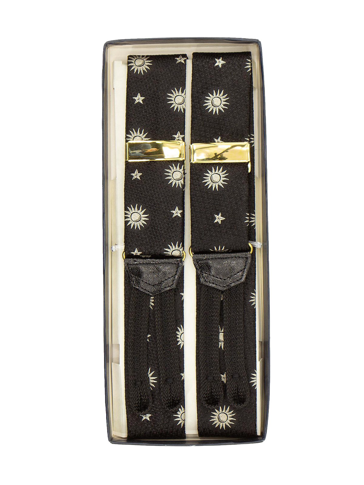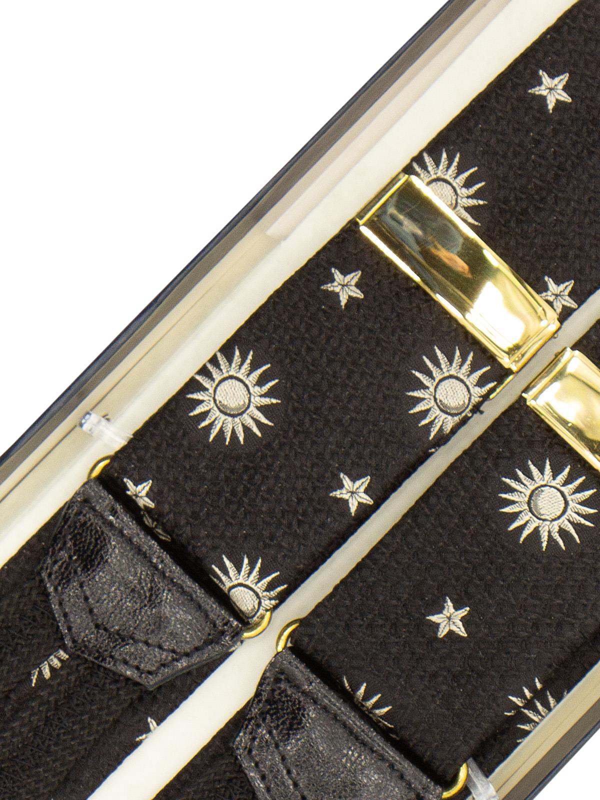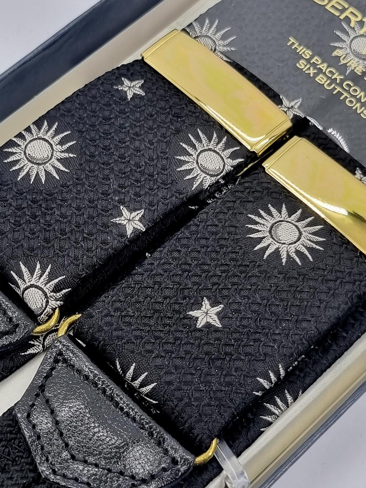 Handcrafted deadstock trouser braces in a distinctive silver sun and stars repeat pattern on a black background, finished with woven loops for fastening to trouser waist buttons. Expertly handmade and fitted with adjustable brass fittings for a refined, comfortable fit, they feature a classic ‘Y’ back construction.