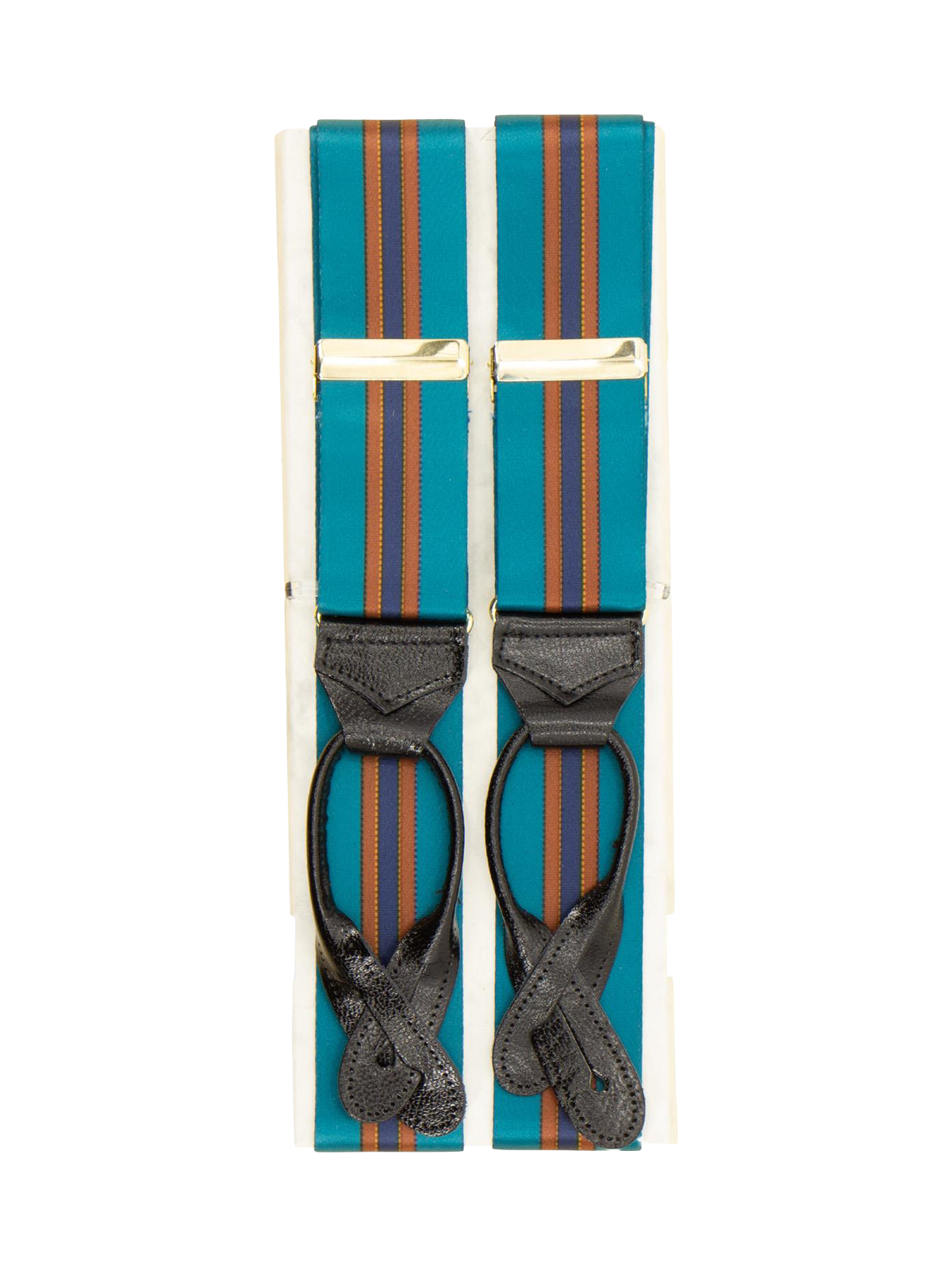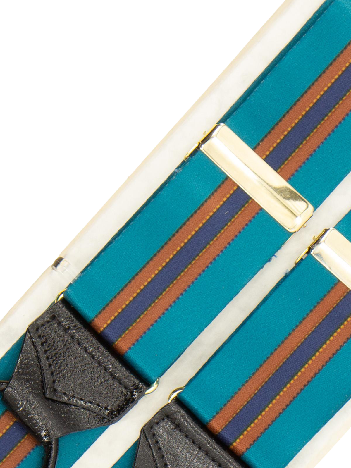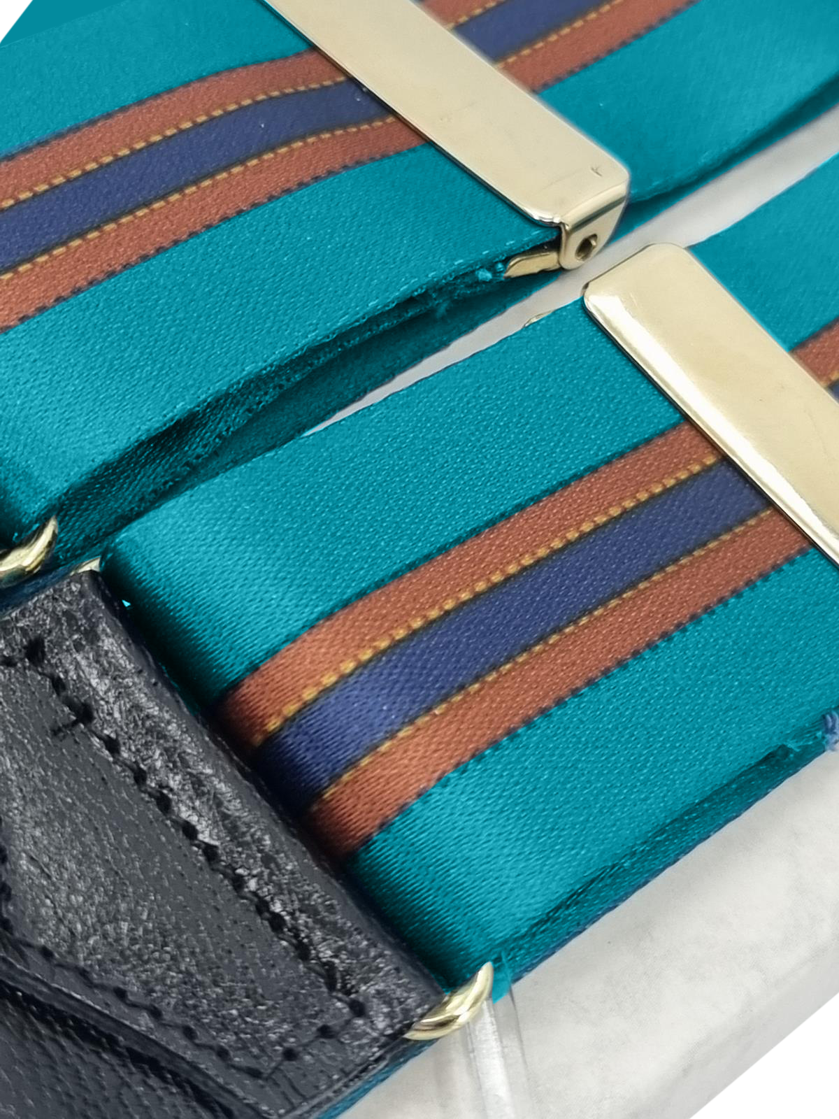 Handmade high quality deadstock trouser braces in turquoise satin with brown and navy stripes, finished with leather loops for attaching to trouser waist buttons. Elasticated for comfort and flexibility, they are adjustable with brass fittings and cut in a classic ‘Y’ back design.