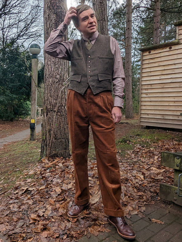 30 4 in stock32 5 in stock34 13 in stock36 8 in stock38 13 in stock+21950s Vintage Chuck Tweed Peg Trousers - Spice Orange£74.99£52.49 /Save 30%