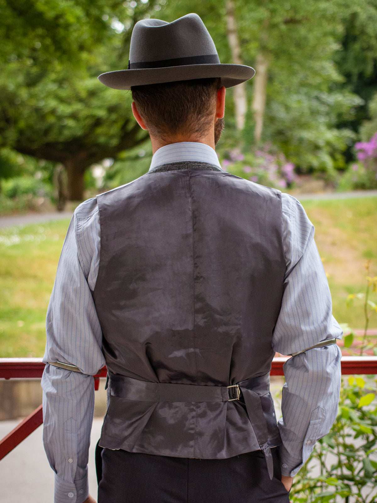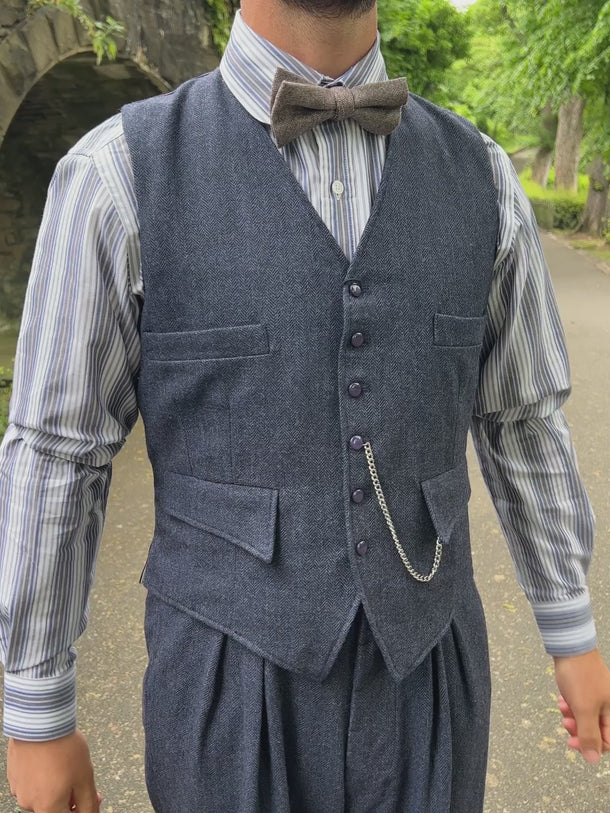 The Granville Waistcoat is an authentic reproduction inspired by original 1930s–1940s waistcoats from our archive collection. With a shorter vintage cut designed to sit perfectly over high-waisted trousers, it delivers a strong midcentury silhouette with refined tailoring.